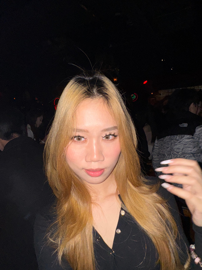 An East Asian female is depicted in a close-up, waist-up portrait within a dark, low-light indoor setting, identified as the city of Liangjiang, China. The subject directly faces the camera, maintaini…read more
