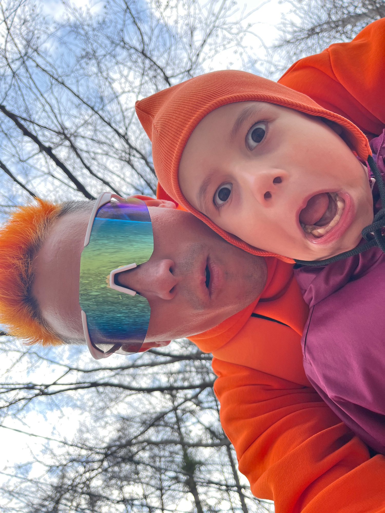 An upside-down, low-angle shot captures two individuals, an adult and a child, looking down towards the camera against a backdrop of bare tree branches and a bright sky. The perspective makes them app…read more