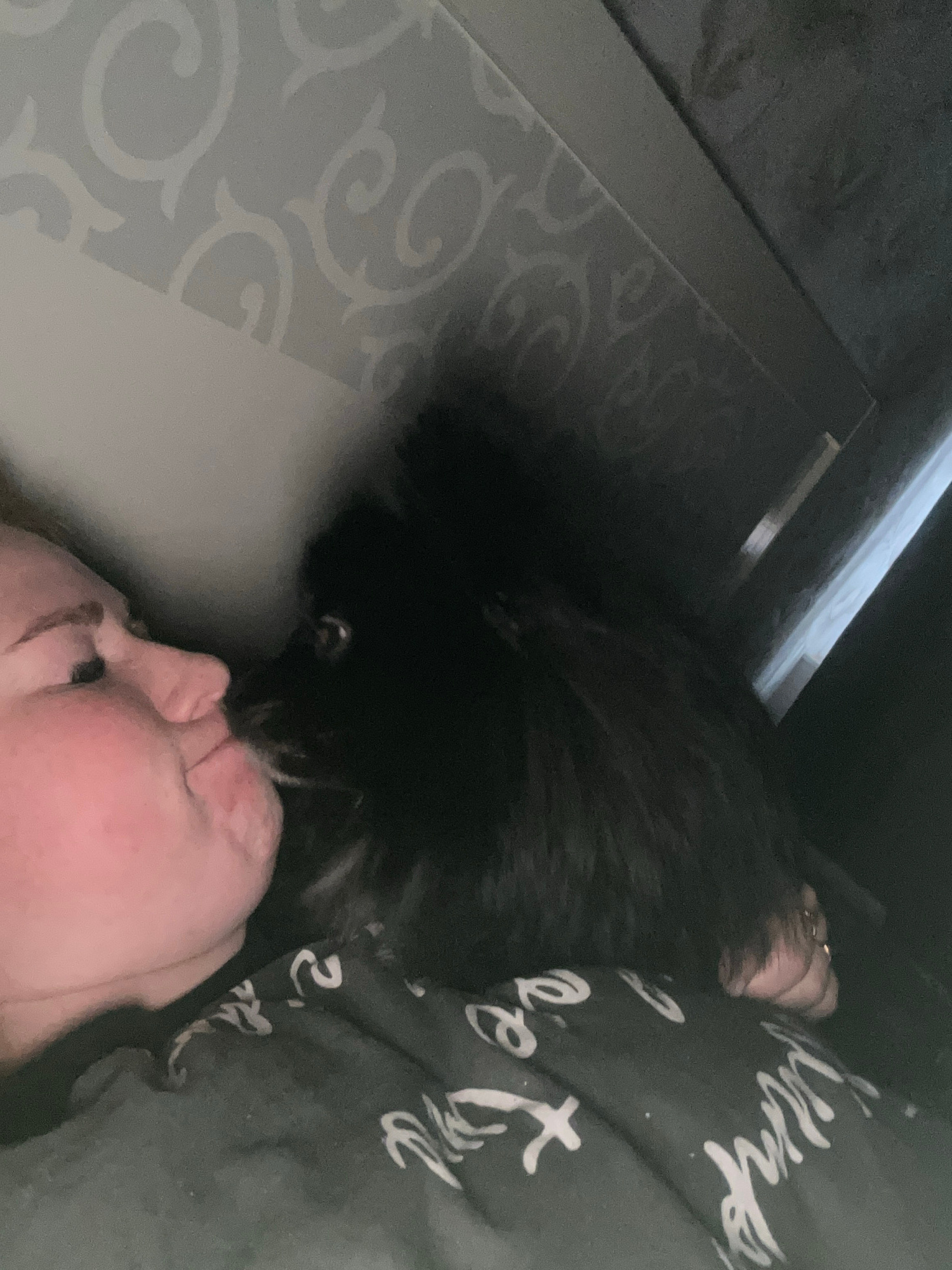 A close-up shot depicts a person's face with their eyes closed, lying next to a fluffy black dog. The person is on a patterned gray and white surface, likely a bed. Part of a gray blanket with white w…read more