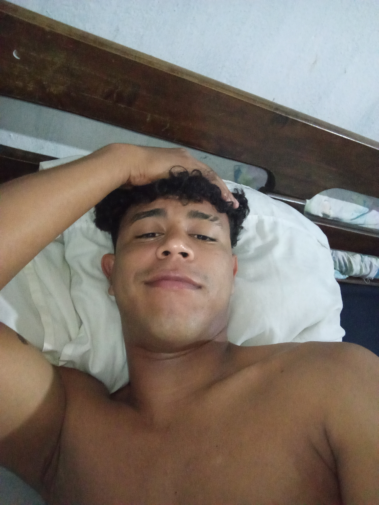 A young man is depicted lying down, seen from a slightly elevated, close-up perspective. He has short, dark, curly hair and is shirtless. His right arm is bent, with his hand resting on the top of his…read more