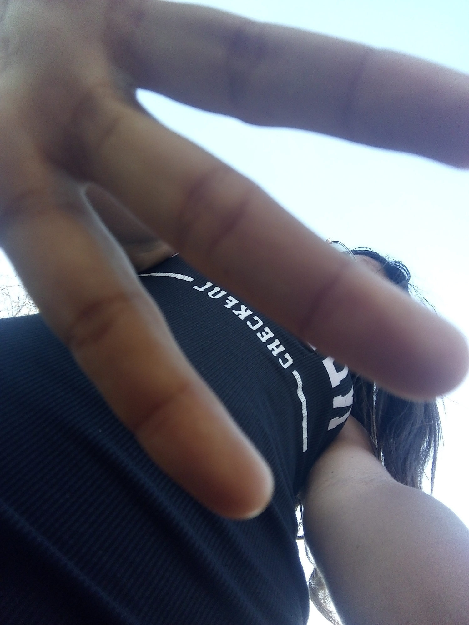 A close-up, low-angle shot shows a person with a hand extended towards the camera. The person is wearing a black ribbed top with the word "CHECKER" printed vertically in white letters. Strands of dark…read more