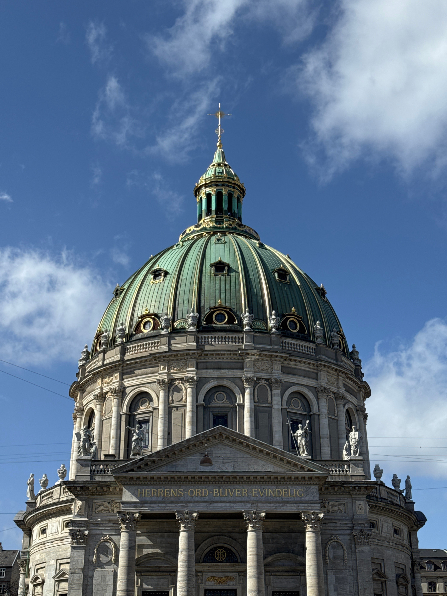 The image shows the Marble Church, also known as Frederik's Church, in Copenhagen, Denmark, from a low angle, emphasizing its large dome. The dome is green and copper-colored, with a central spire. Th…read more