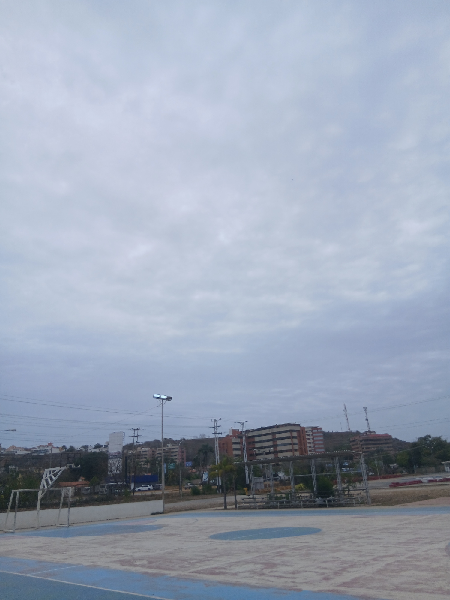 This image captures an outdoor scene of a sports court and a hillside, likely in Pampatar, Venezuela. In the foreground, a faded blue and white painted court, possibly for basketball or volleyball, is…read more