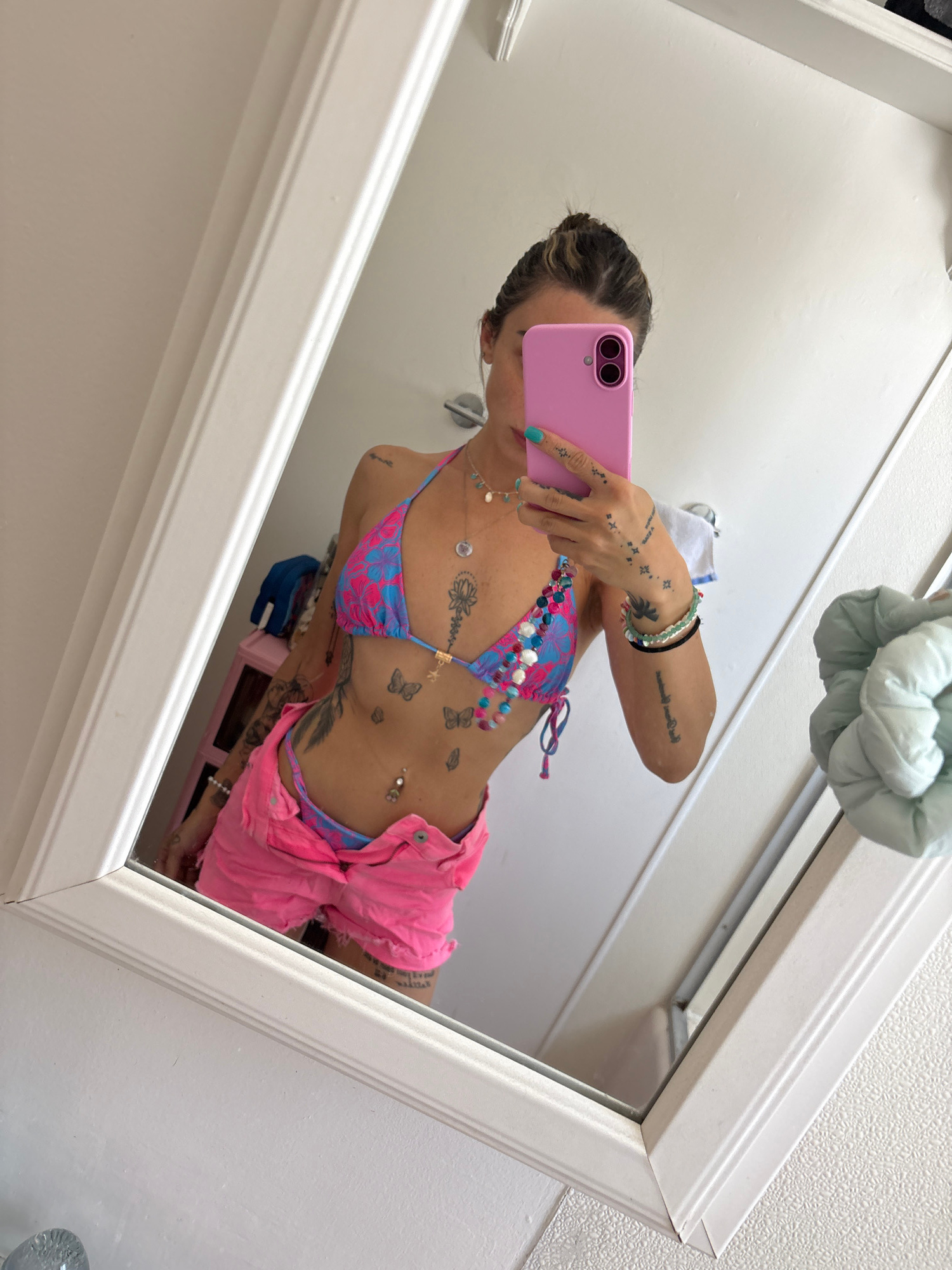 A mirror selfie, taken at an undisclosed location in Seal Beach, CA. The person is holding a pink cell phone. The person is wearing a floral bikini top, pink shorts, and jewelry. The bathroom has a wh…read more