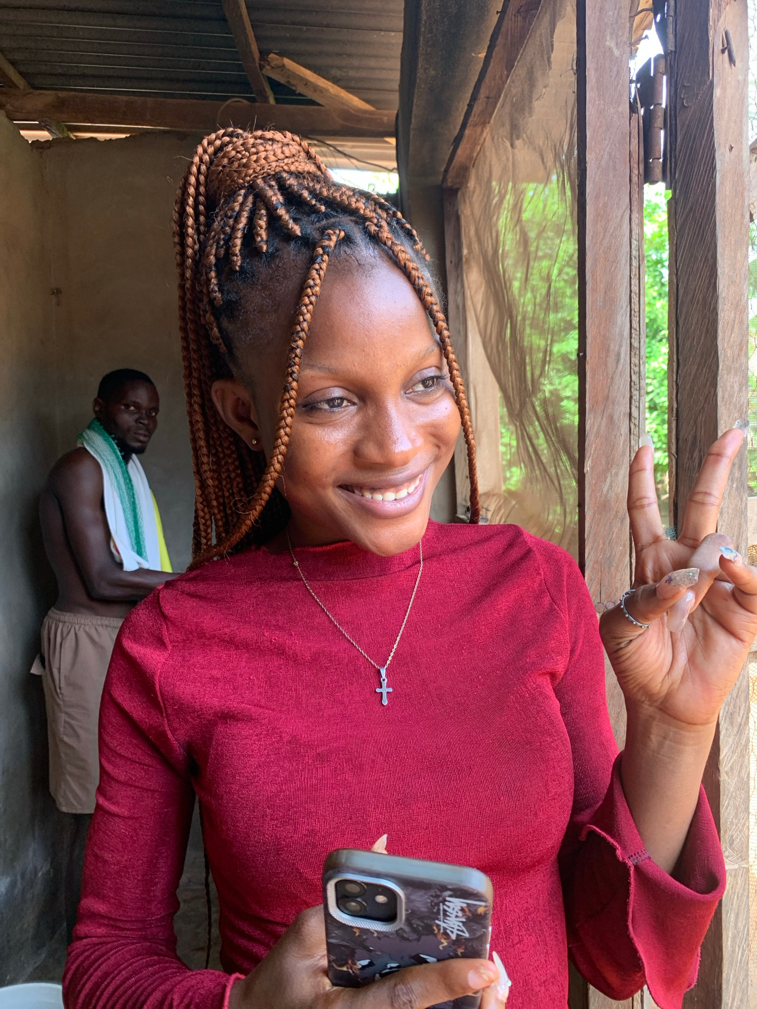 A woman with braided hair, wearing a red top and a silver necklace with a cross pendant, is holding a phone and making a peace sign with her hand. She is smiling and appears to be taking a selfie. Beh…read more