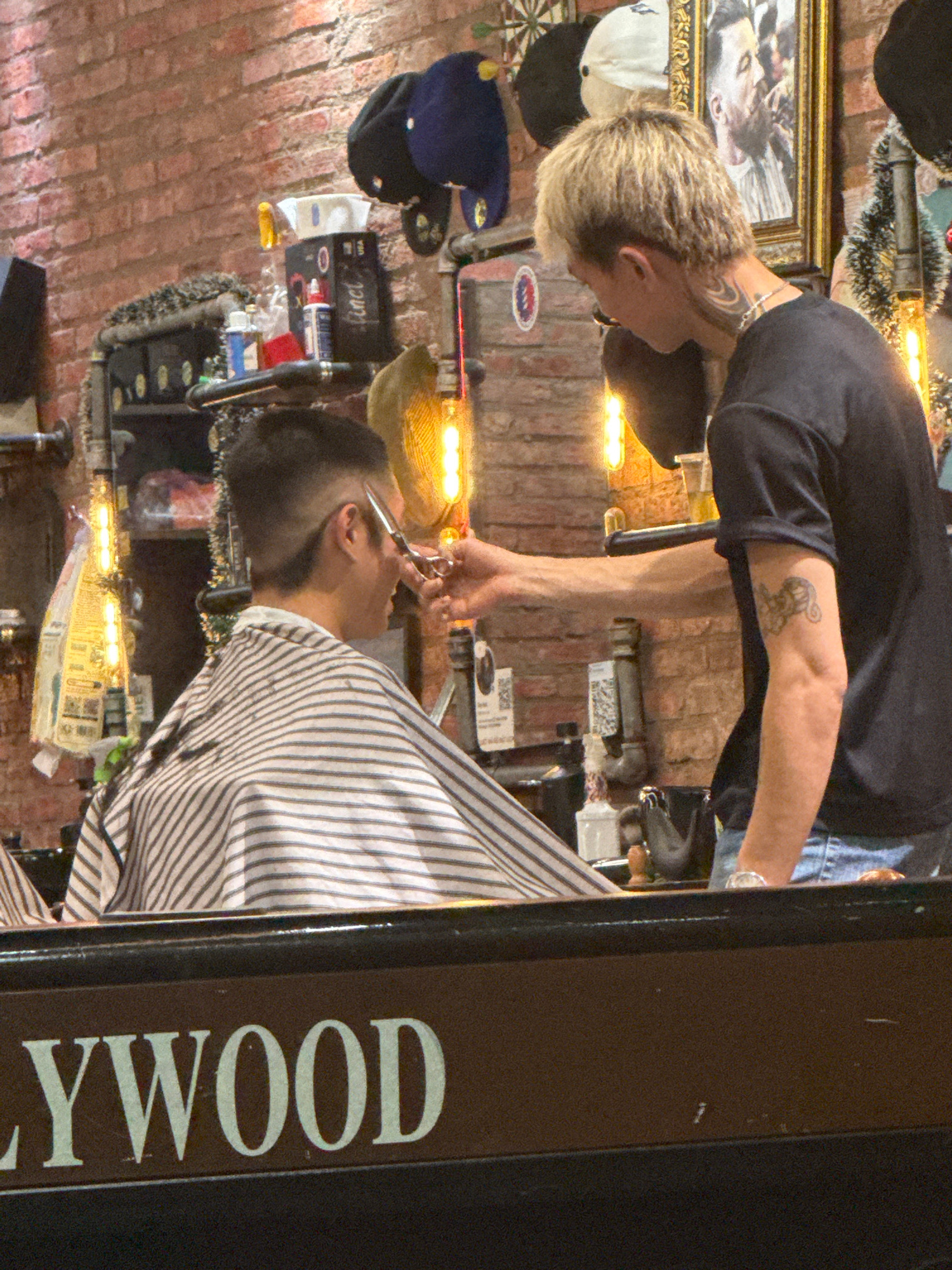 In Đà Nẵng, Vietnam, the image shows a male barber with blonde hair and tattoos cutting a customer's hair in a barbershop. The barber wears a black t-shirt and jeans. The customer is draped in a strip…read more