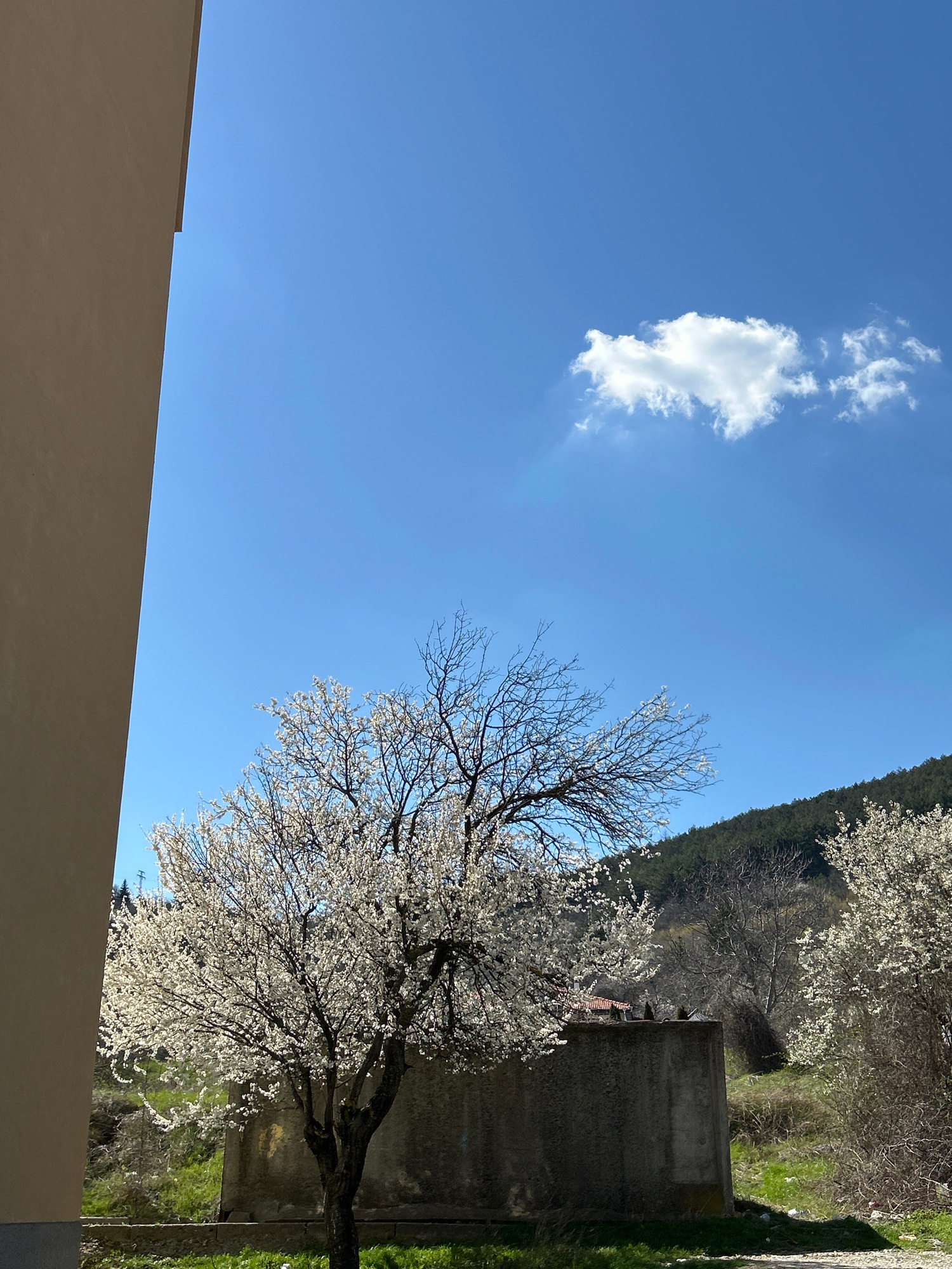 A vertical shot showing a clear blue sky with one small, white cumulus cloud in the upper left quadrant. A beige wall occupies the lower left corner. A tree covered in white blossoms is positioned in…read more