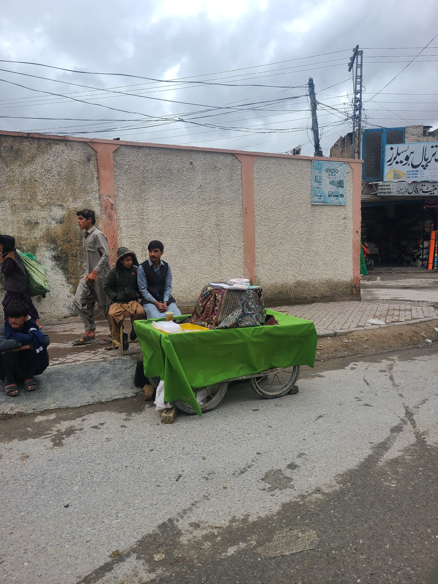 The scene shows a group of people gathered on a sidewalk in Quetta City Tehsil, Pakistan. A pushcart covered with a green tarp stands beside a wall, displaying fabrics. Several men are either sitting,…read more