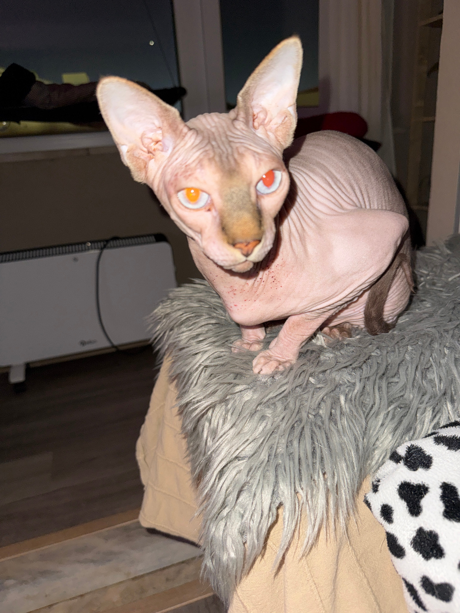 A hairless cat with orange eyes is lying on a gray, furry cushion, a tan blanket, and a black and white cow-print patterned cushion. The cat is facing the camera. A white appliance, possibly a heater,…read more
