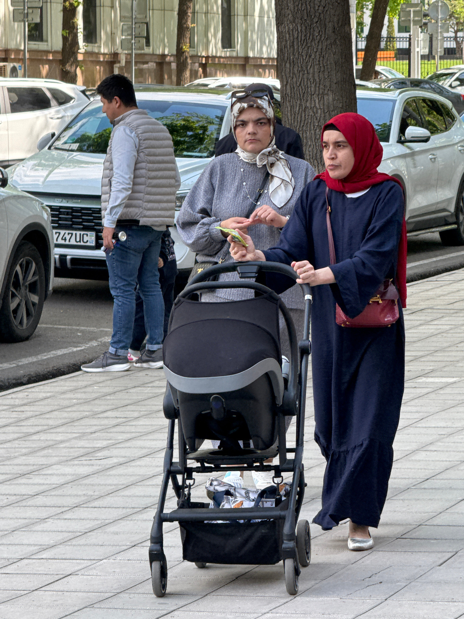 Two women, one wearing a red hijab and a navy blue dress, and the other wearing a patterned headscarf and gray sweater, stand next to a baby stroller on a paved sidewalk. The woman in red is holding t…read more