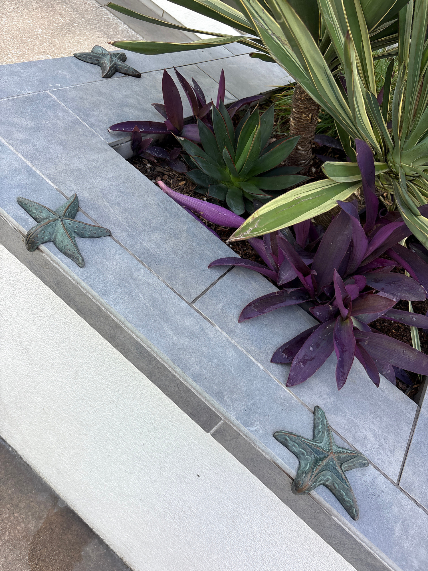 An outdoor garden or landscape feature is depicted from an angled, top-down perspective, showcasing a variety of plants within a raised planter box. The planter is constructed from light gray rectangu…read more