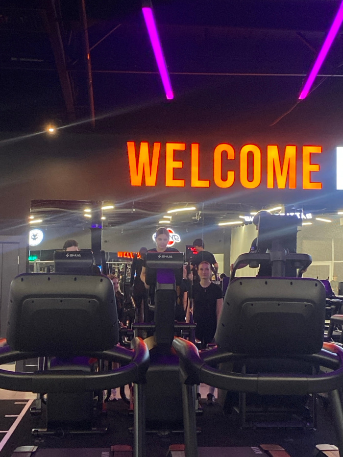Indoor cycling class with stationary bikes lined up in rows. A large vertical LED display reads "WELCOME" in orange letters. Purple neon lights are visible. Participants are on the bikes, seemingly en…read more