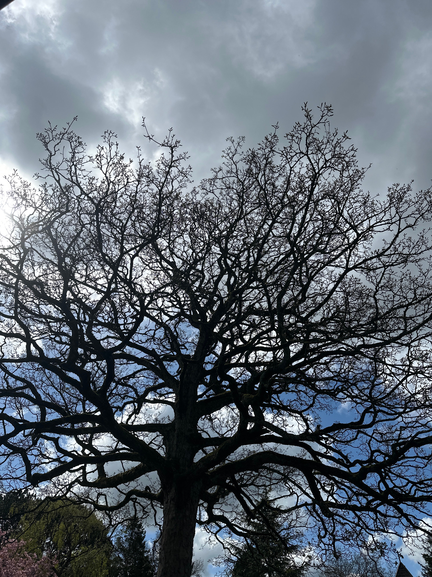 The image shows a view looking up into the bare branches of a large tree against a cloudy sky. The branches are dark and intricate, contrasting with the patches of blue sky visible through them. Some…read more