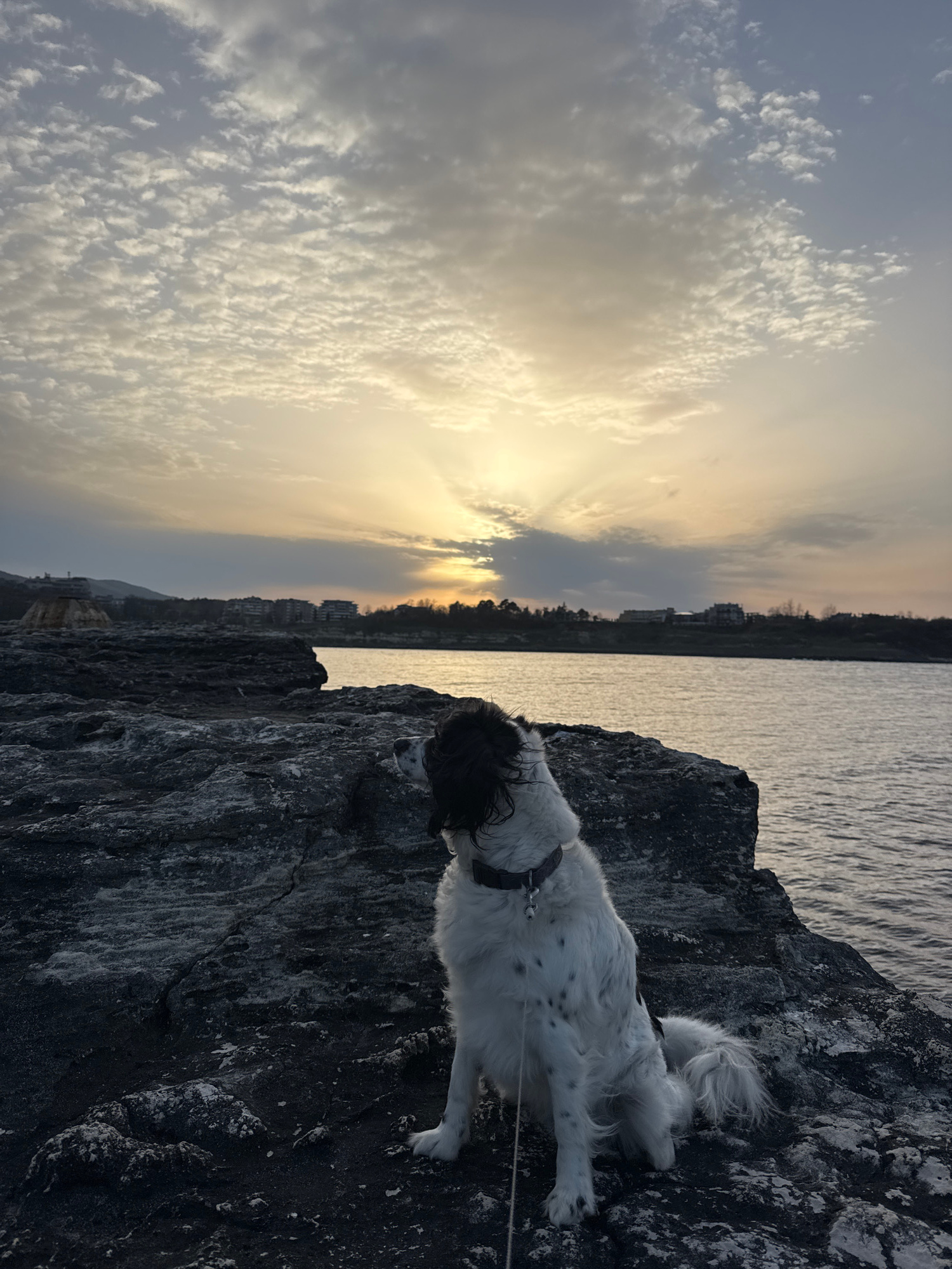 A vertical, full shot captures a dog on a rocky outcrop along the Black Sea, potentially in the area of Tsarevo, Bulgaria. The dog, primarily white with black spots, is standing on the rocks, wearing…read more