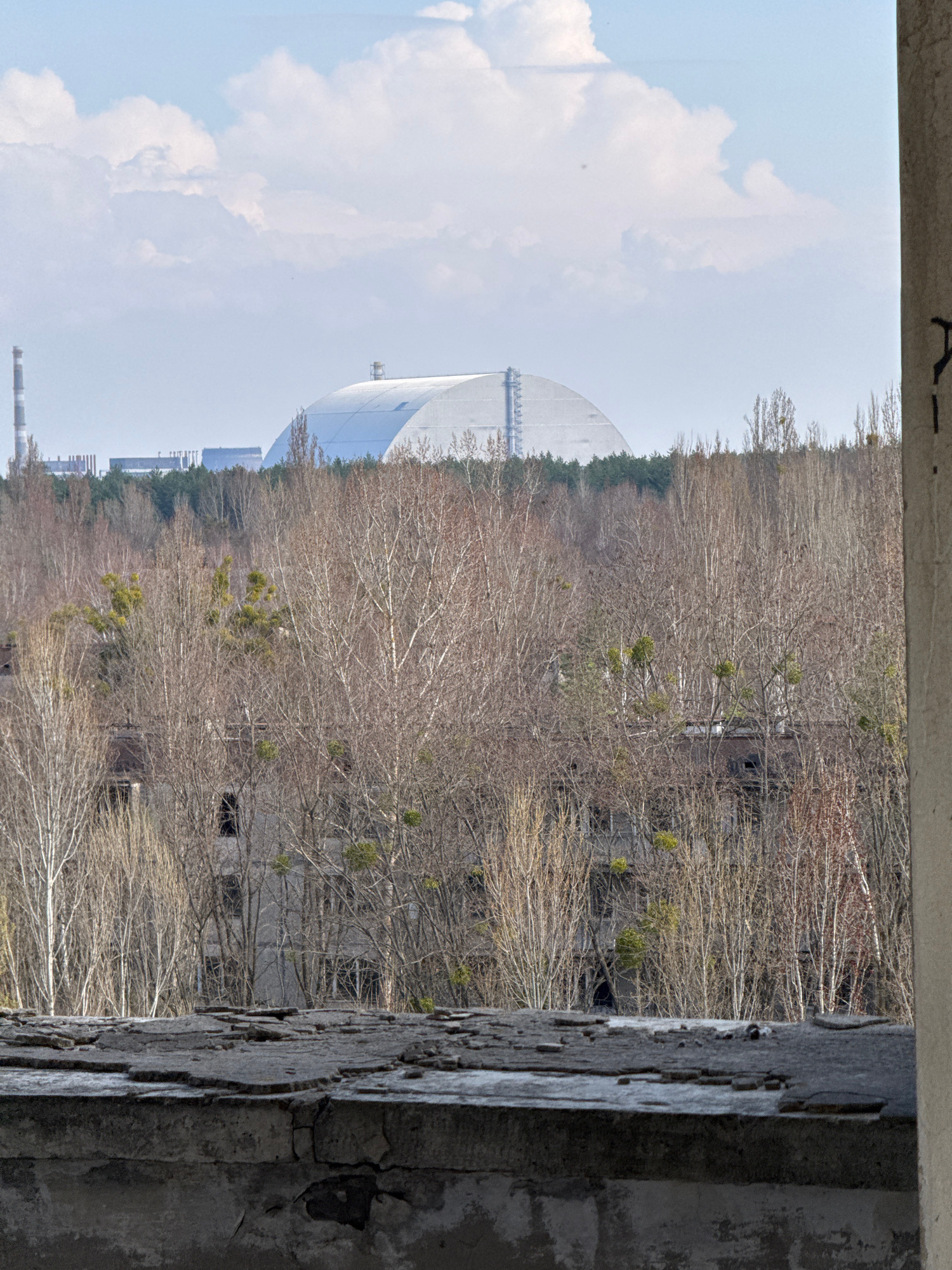 The image, taken from inside a dilapidated concrete structure, provides a partial view of the Chernobyl Nuclear Power Plant sarcophagus and the surrounding area in Prypiat, Ukraine. A dense, leafless…read more