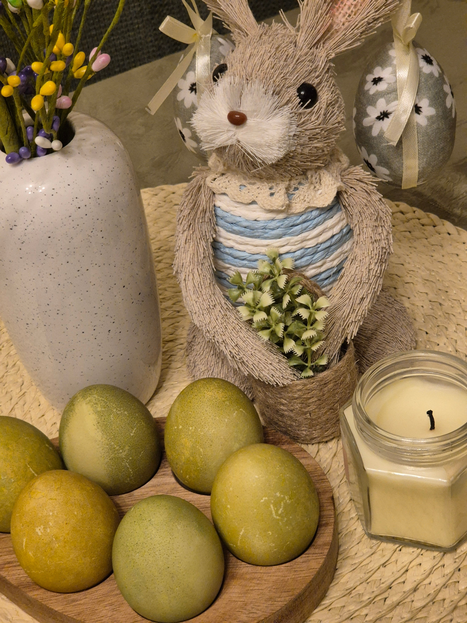 The image is a close-up still life arrangement of Easter decorations. A straw bunny lies on a woven placemat. Two decorative eggs with white flower patterns and cream ribbons are placed nearby. A squa…read more