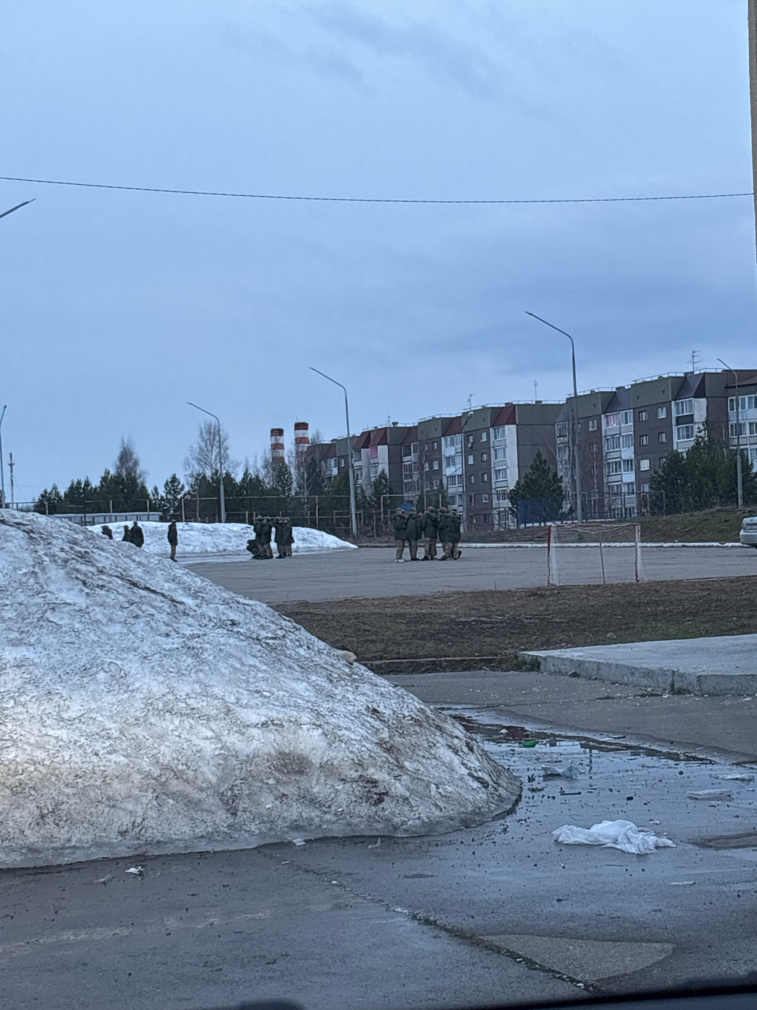 The image shows an urban scene, likely in the city of Markovskii, Russia, based on the architectural style of the buildings in the background. In the middle ground, there is a group of several people,…read more