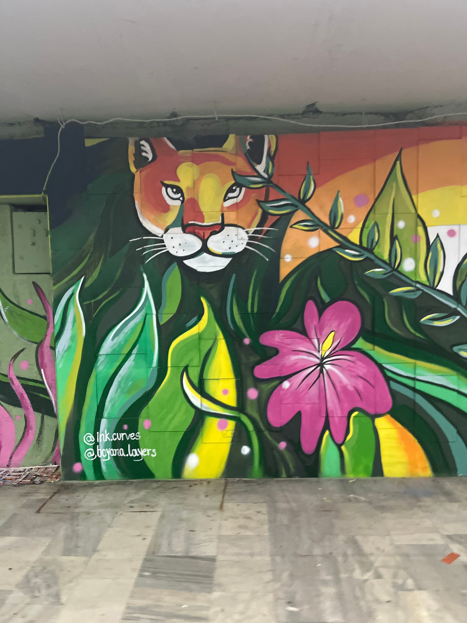 The image displays a vibrant mural painted on a wall, presented sideways. When viewed upright, the artwork features a stylized animal face, resembling a tiger or lion, peering from a dense jungle of gā¦read more