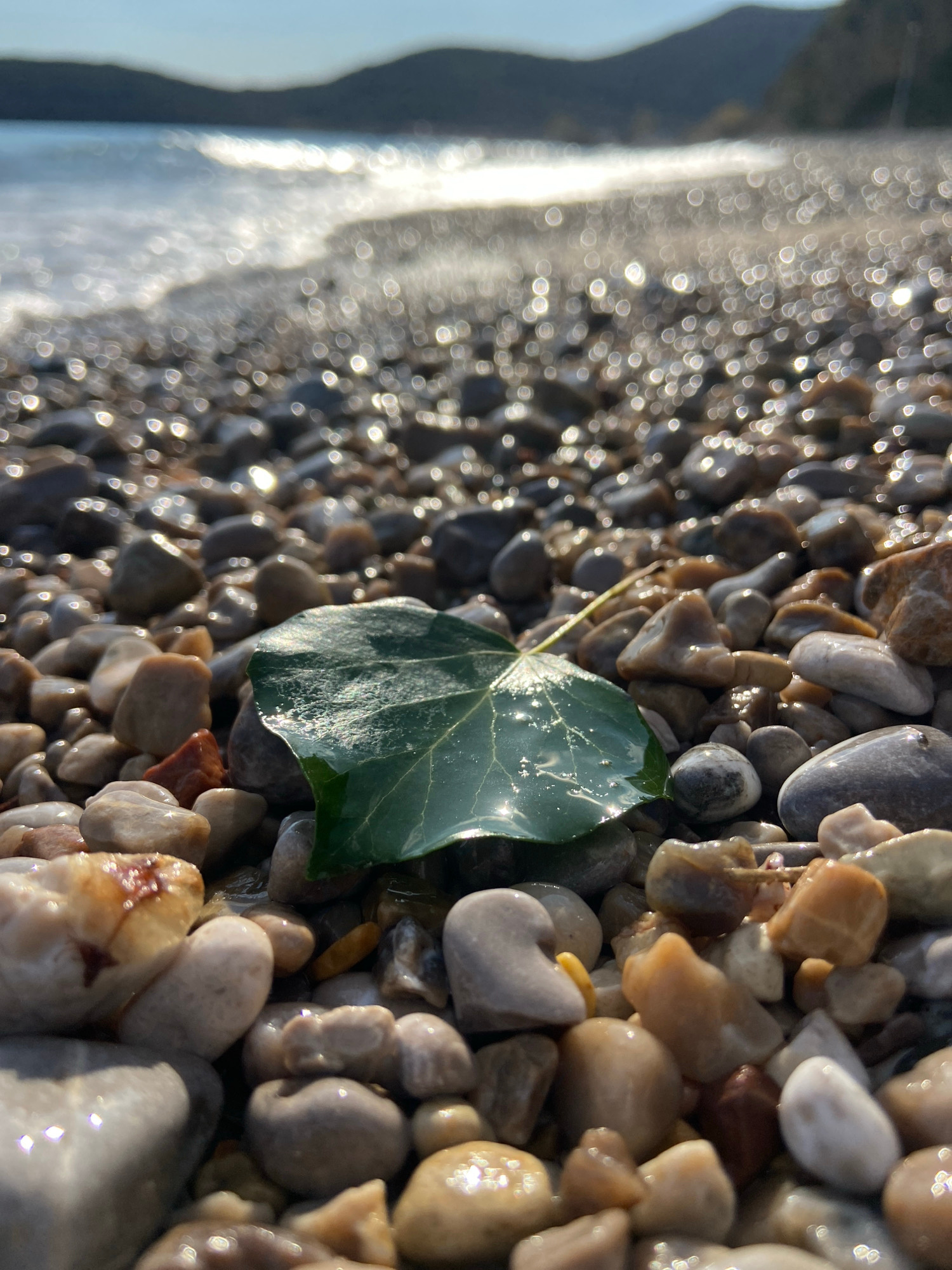 The image depicts a close-up view of pebbles on a beach. The pebbles vary in color, ranging from light beige to gray and dark brown. A single, glossy green leaf rests on the pebbles. The edge of the w…read more