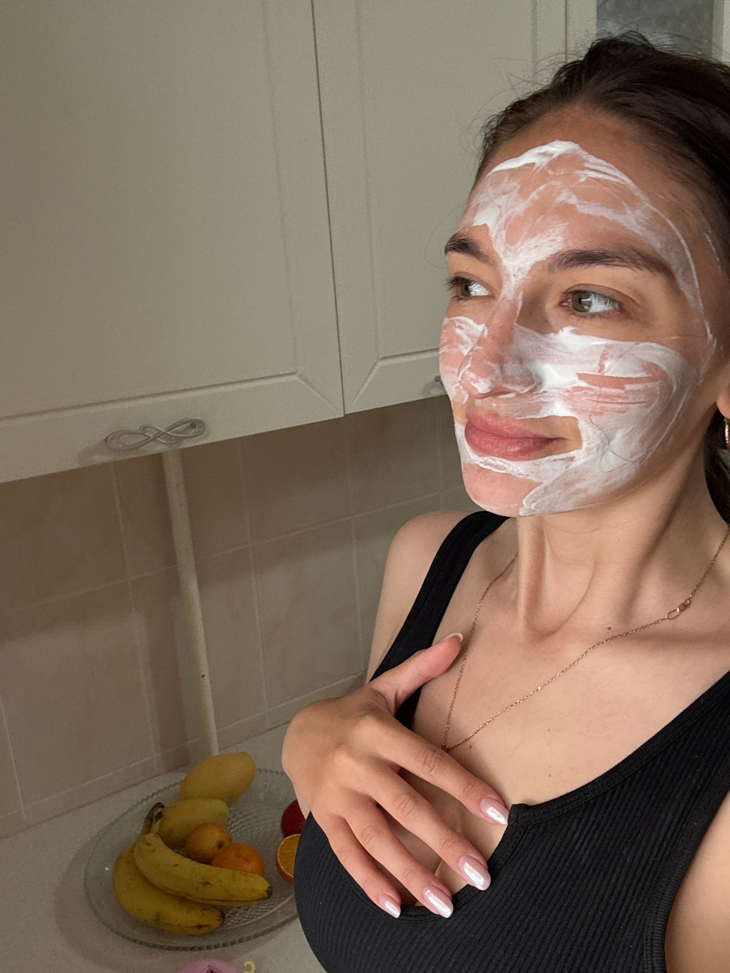 A woman with a white facial mask poses for a selfie in an indoor setting. She is wearing a black tank top and a delicate gold necklace. Her manicured hand rests near her chest. A fruit bowl containing…read more