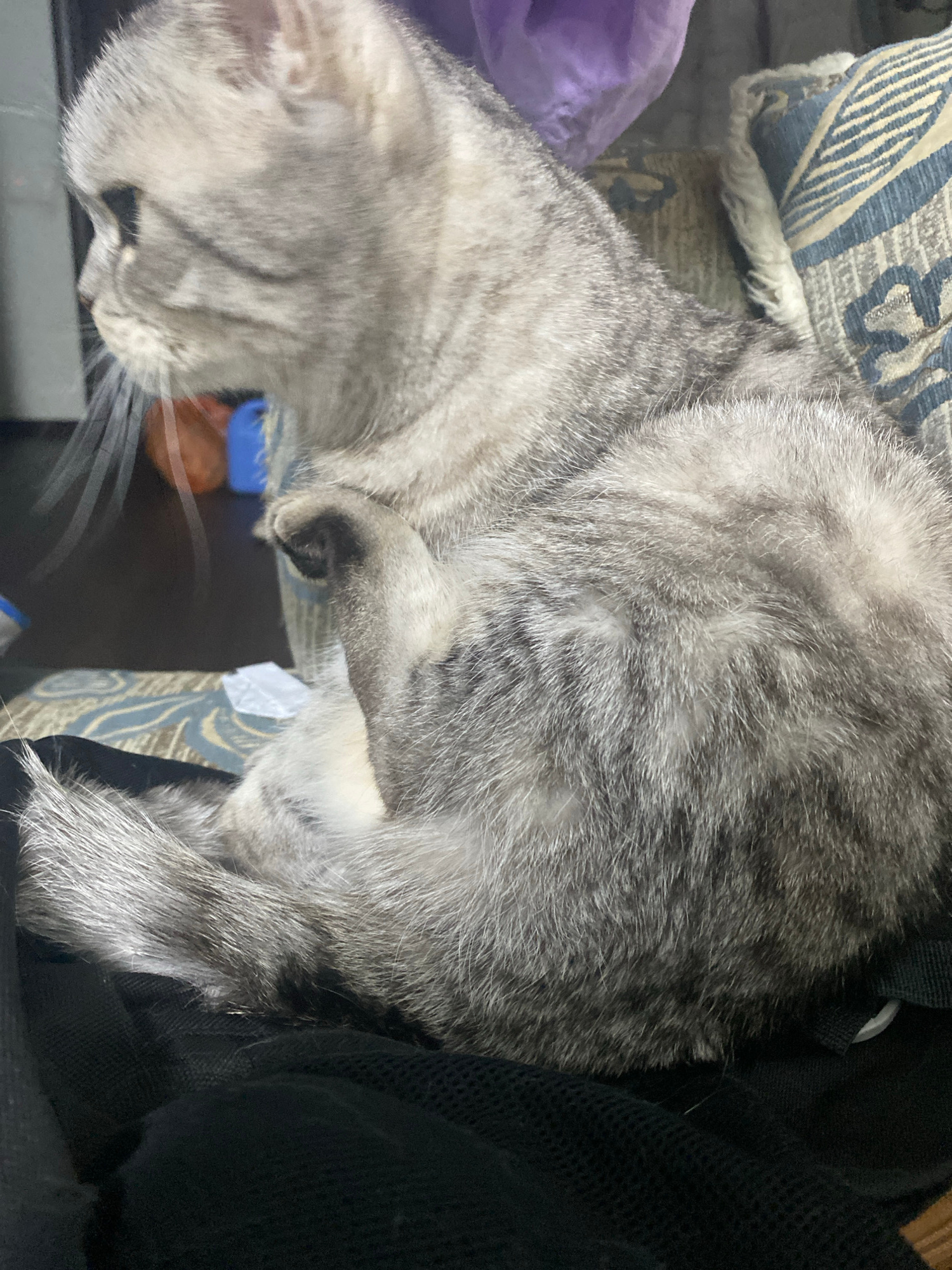 A grey and white tabby cat is the central subject of this indoor image, likely captured in Chaikovsky, Russia. The cat is shown resting or sleeping, curled up on what appears to be furniture. Its head…read more
