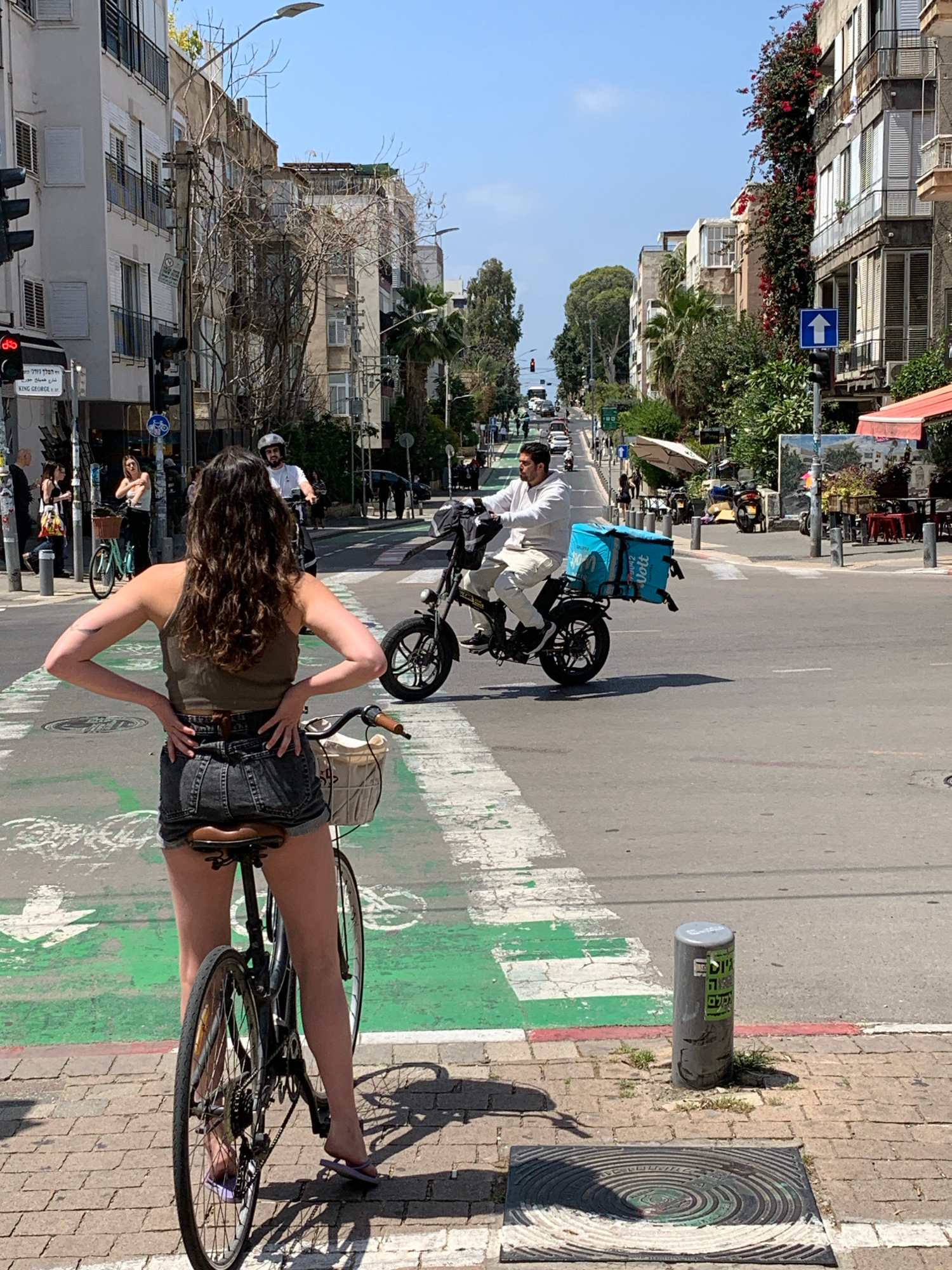 The scene is a street in Tel Aviv, Israel. A woman with long brown hair, wearing a brown top and denim shorts, is straddling a bicycle on a green bike path. A man is riding an electric scooter, wearin…read more