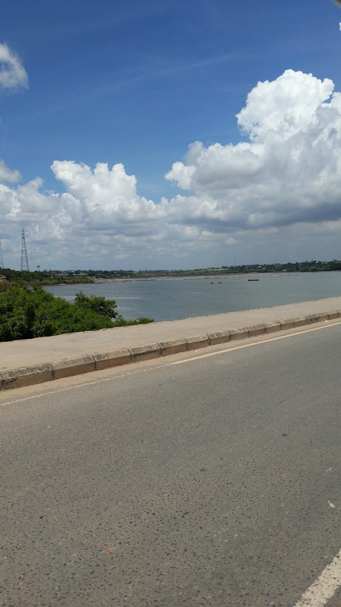 The image shows a section of a road, likely a bridge, with a body of water to the left. The sky is visible in the upper left corner, featuring blue sky and white clouds. A line of green vegetation isβ¦read more