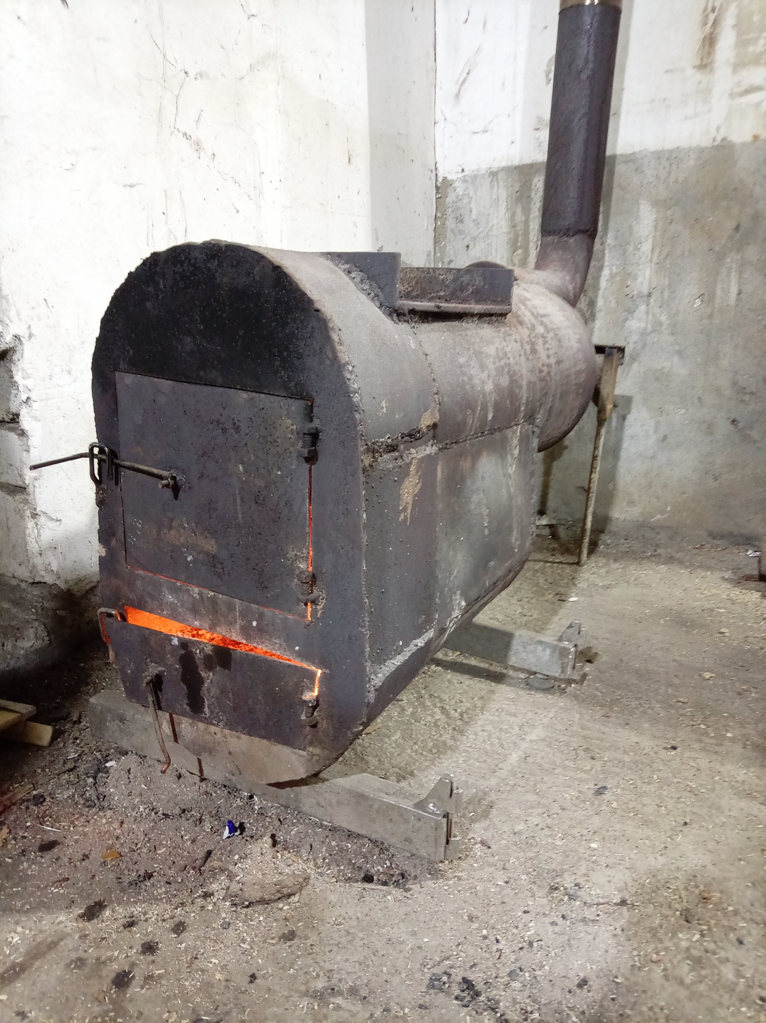 The image shows a large, black, cylindrical wood-burning stove inside a building, likely in a city that could be Марковский, Russia given the request. The stove has a door on the front, with a small o…read more