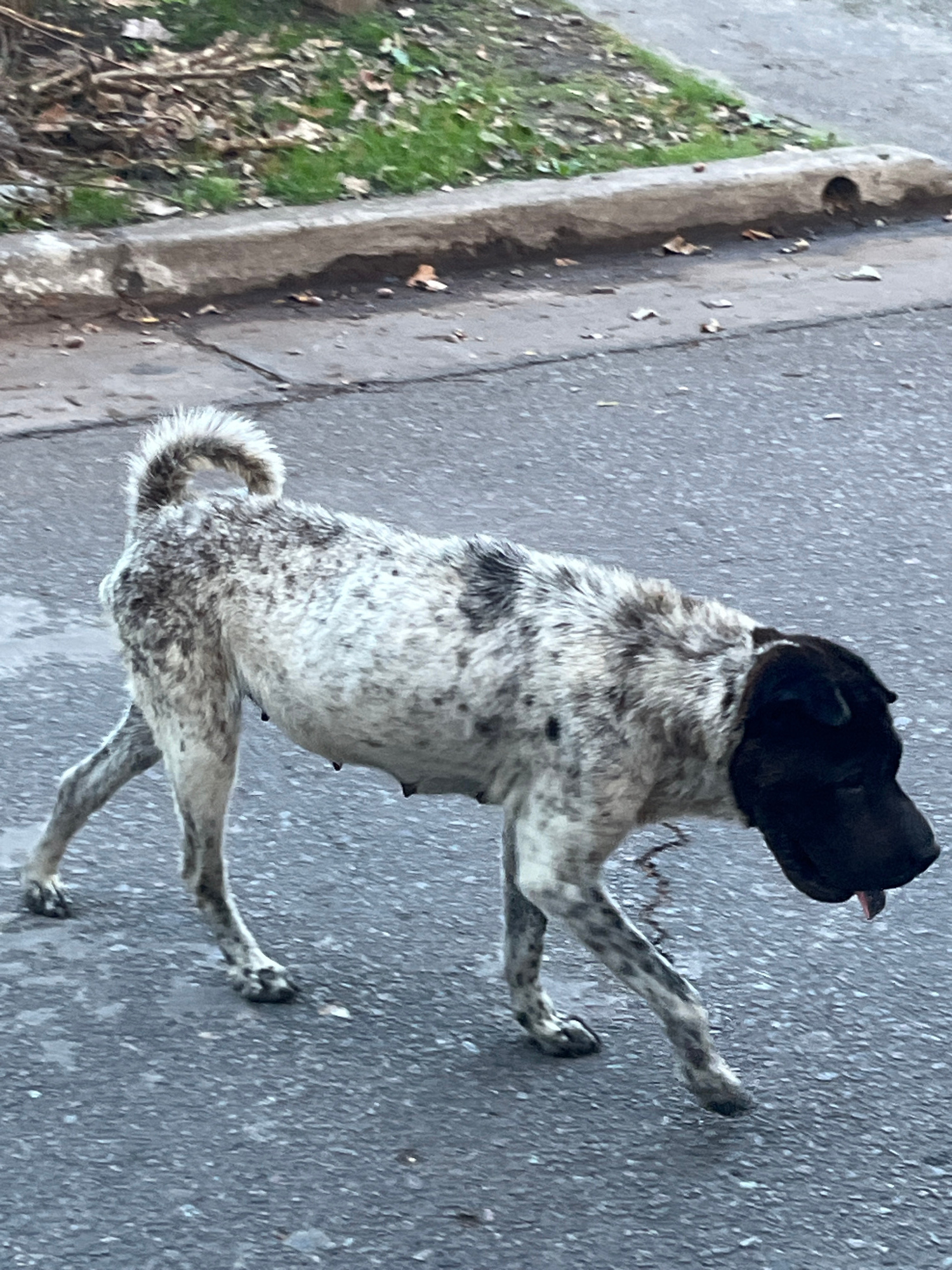 A medium-sized dog with a predominantly speckled coat, including gray, black, and white shades, stands on a gray asphalt surface. The dog has a black head, and its tongue is slightly visible. The dog'…read more