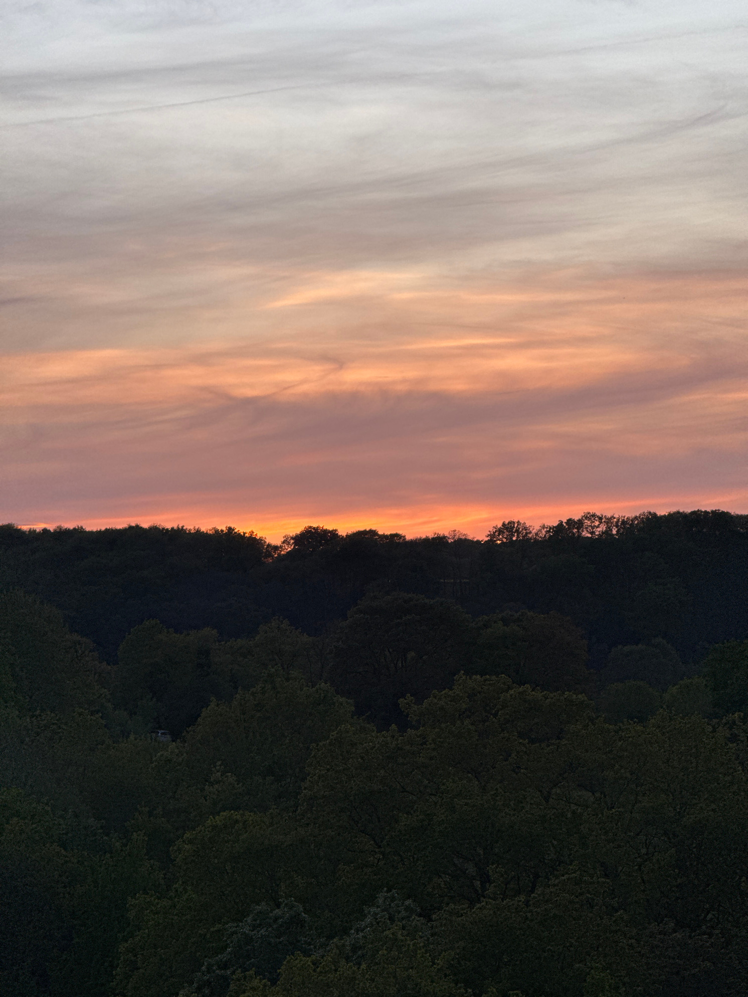 The image depicts a serene natural landscape, likely captured during a sunset or sunrise in Bures-sur-Yvette, France. The scene is bisected horizontally, with the upper portion dominated by a vast sky…read more
