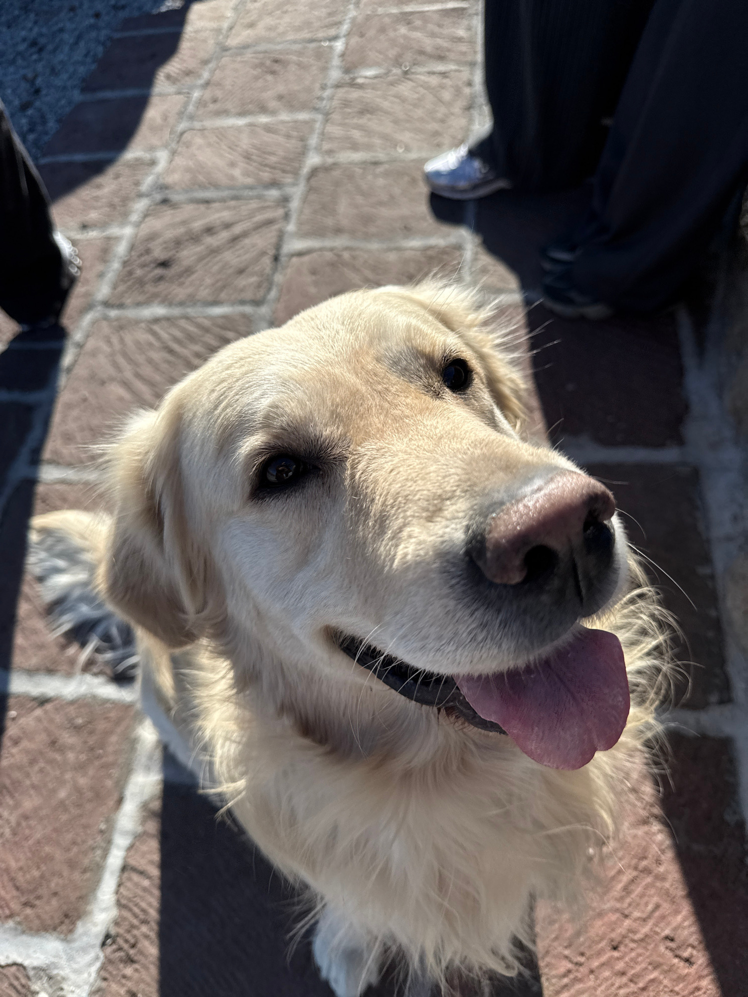 A high-angle shot captures a light-colored Golden Retriever dog looking directly upwards towards the camera, its pink tongue extended. The dog has cream-colored fur and dark eyes, appearing engaged an…read more