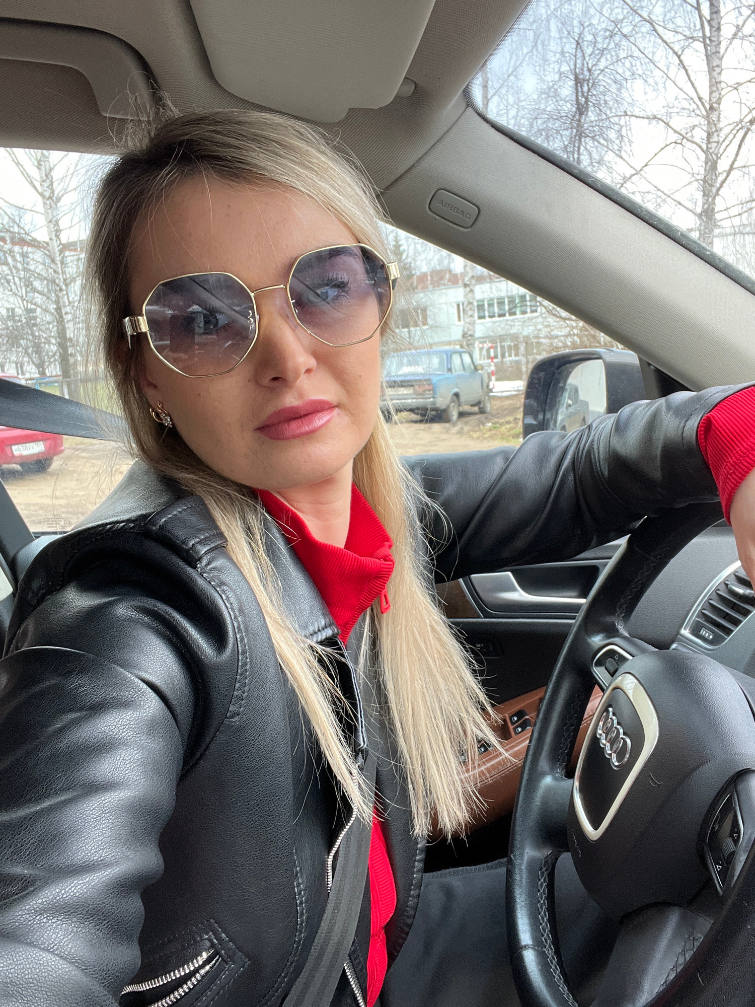 A woman with blond hair and sunglasses is sitting in an Audi car. She is wearing a black leather jacket over a red top. Her left hand is on the steering wheel, which displays the Audi logo. The background shows a street scene, with buildings and vehicles visible through the car windows. The car's interior is gray. Based on the surroundings and the "Airbag" sign in the car, the photograph was most likely taken in the city of Chaikovsky, Russia. | Open Wire