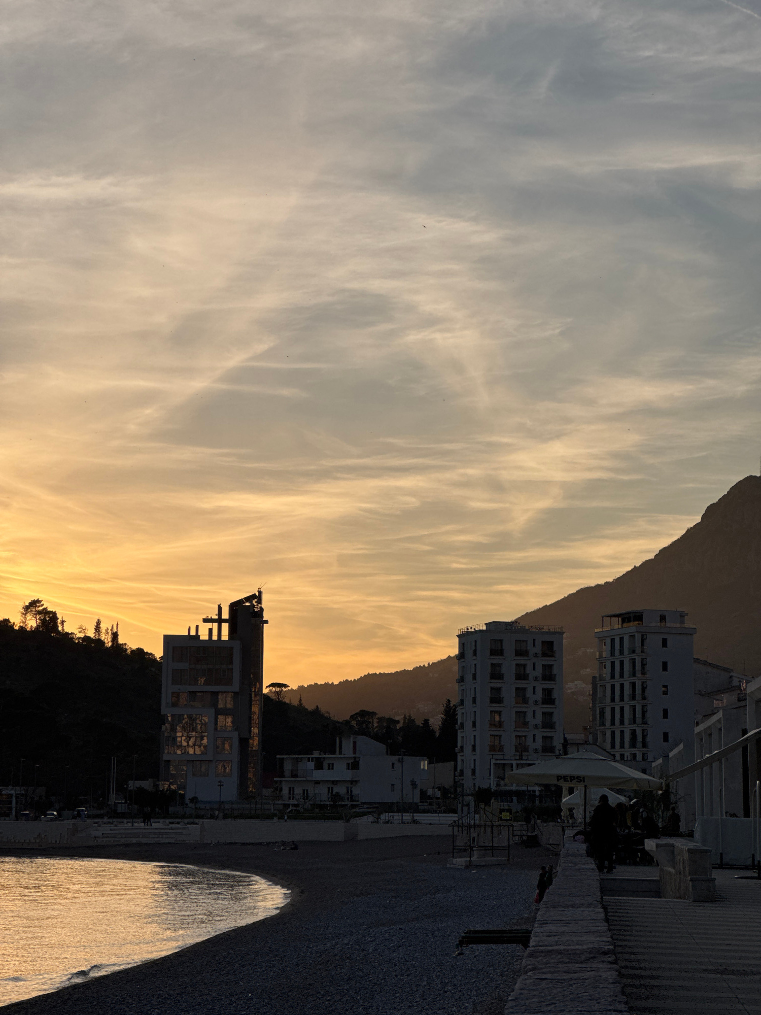 The image shows a beach in Sutomore, Montenegro at sunset. The sky is a mix of gray and orange, with streaks of clouds. Three multi-story buildings line the coast, separated by trees. A beach with dar…read more