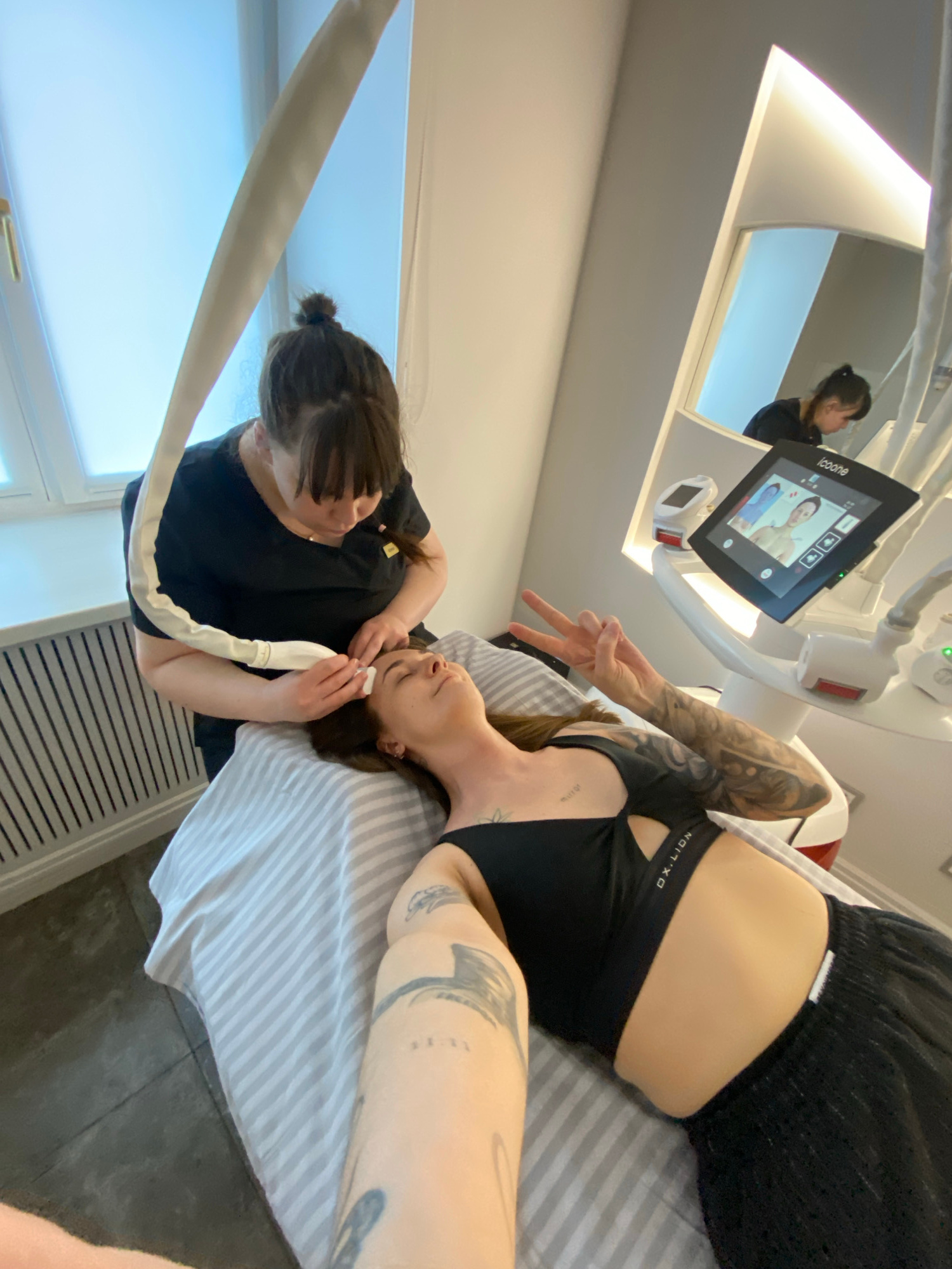 The image shows a woman lying on a striped bed with a tattoo on her arm, while another woman in a black shirt performs a procedure on her face using a white device connected to a flexible hose. The wo…read more