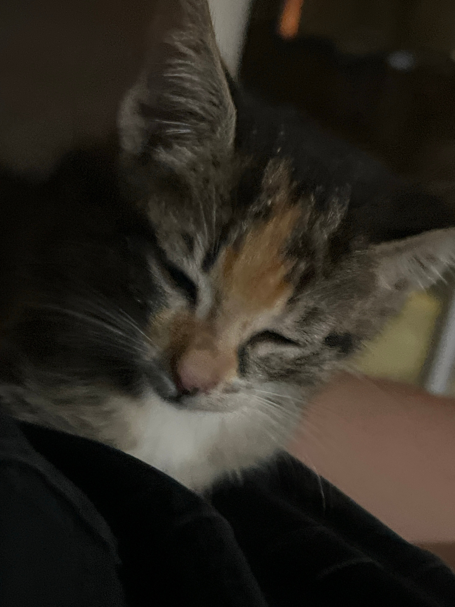 A close-up image shows a kitten resting its head against a person wearing a black shirt. The kitten is predominantly grey, white, and tan, with closed eyes and a pink nose. The person's skin is visibl…read more