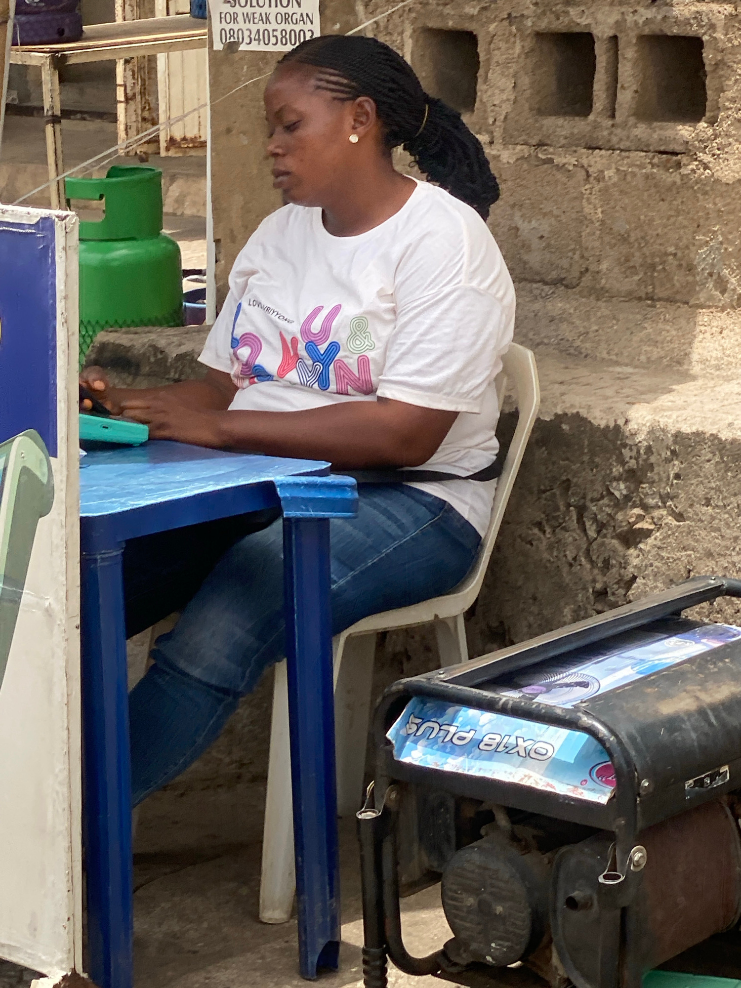A woman with braided hair is seated on a white plastic chair in an outdoor urban setting, possibly in Maiburiji, Nigeria. She is wearing a white t-shirt with colorful lettering and blue jeans. She is…read more
