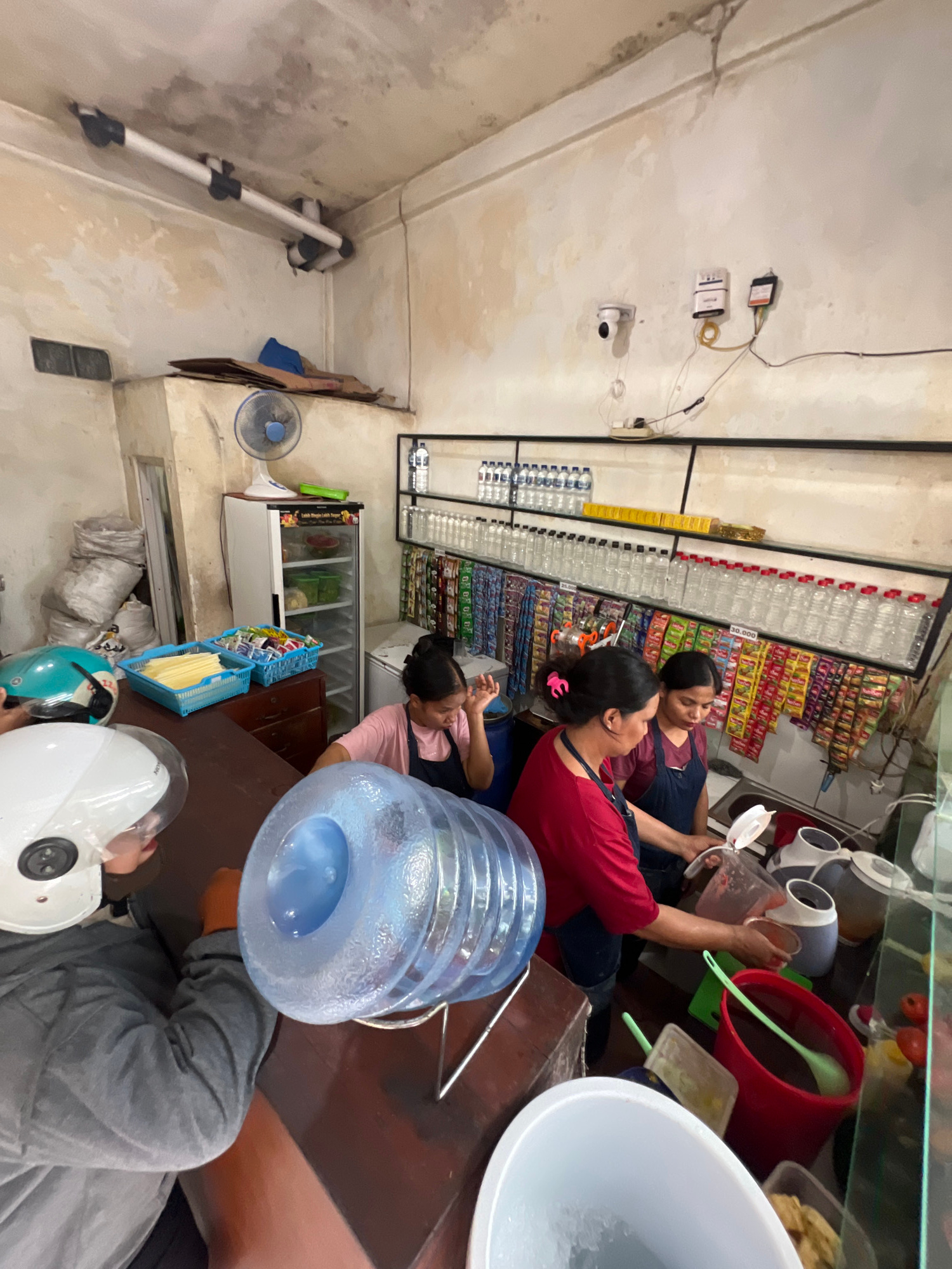 The image shows the interior of a small retail establishment in Jimbaran, Indonesia. Two women wearing aprons stand behind a counter, preparing food or drinks; one wears a red shirt, while the other w…read more