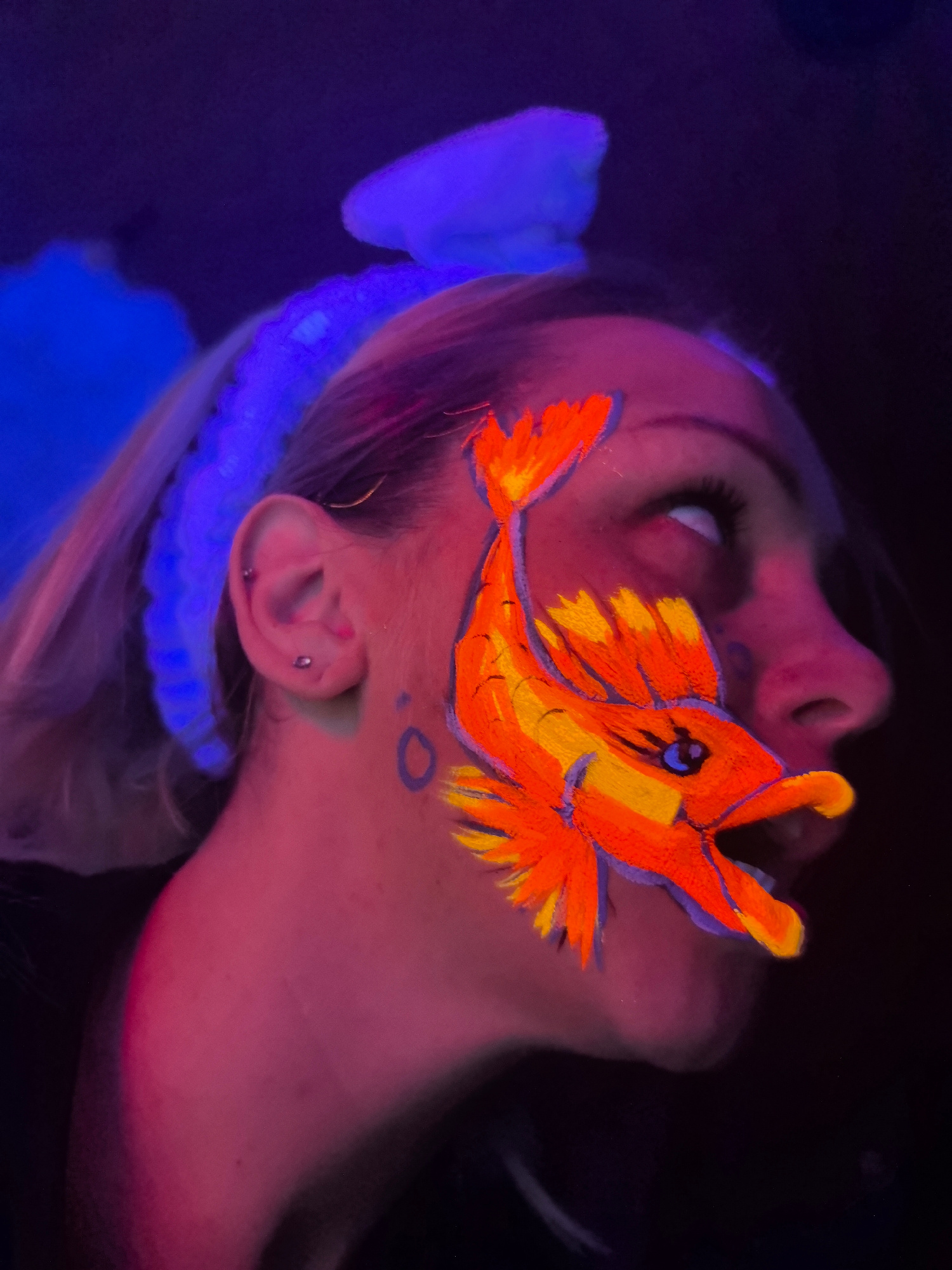 A woman's face is illuminated in a dark environment with neon lighting, creating a vibrant color palette of pinks, oranges, and blues. On her right cheek, there is a stylized face-painted depiction of…read more