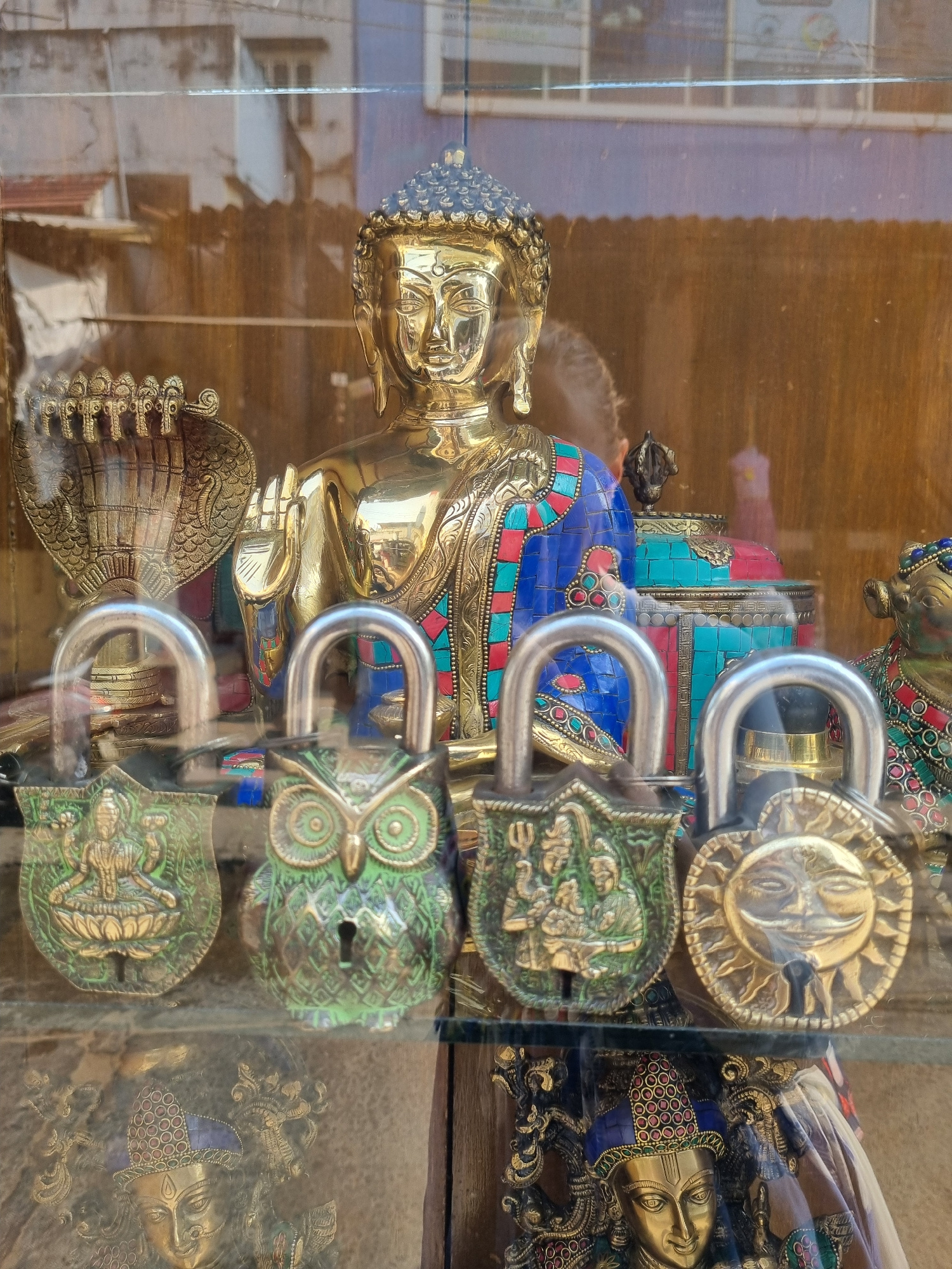 The image shows a window display of a shop in Puttaparthi, India, featuring a golden Buddha statue alongside several decorative padlocks. The padlocks have designs including a sun face, an owl, and a…read more