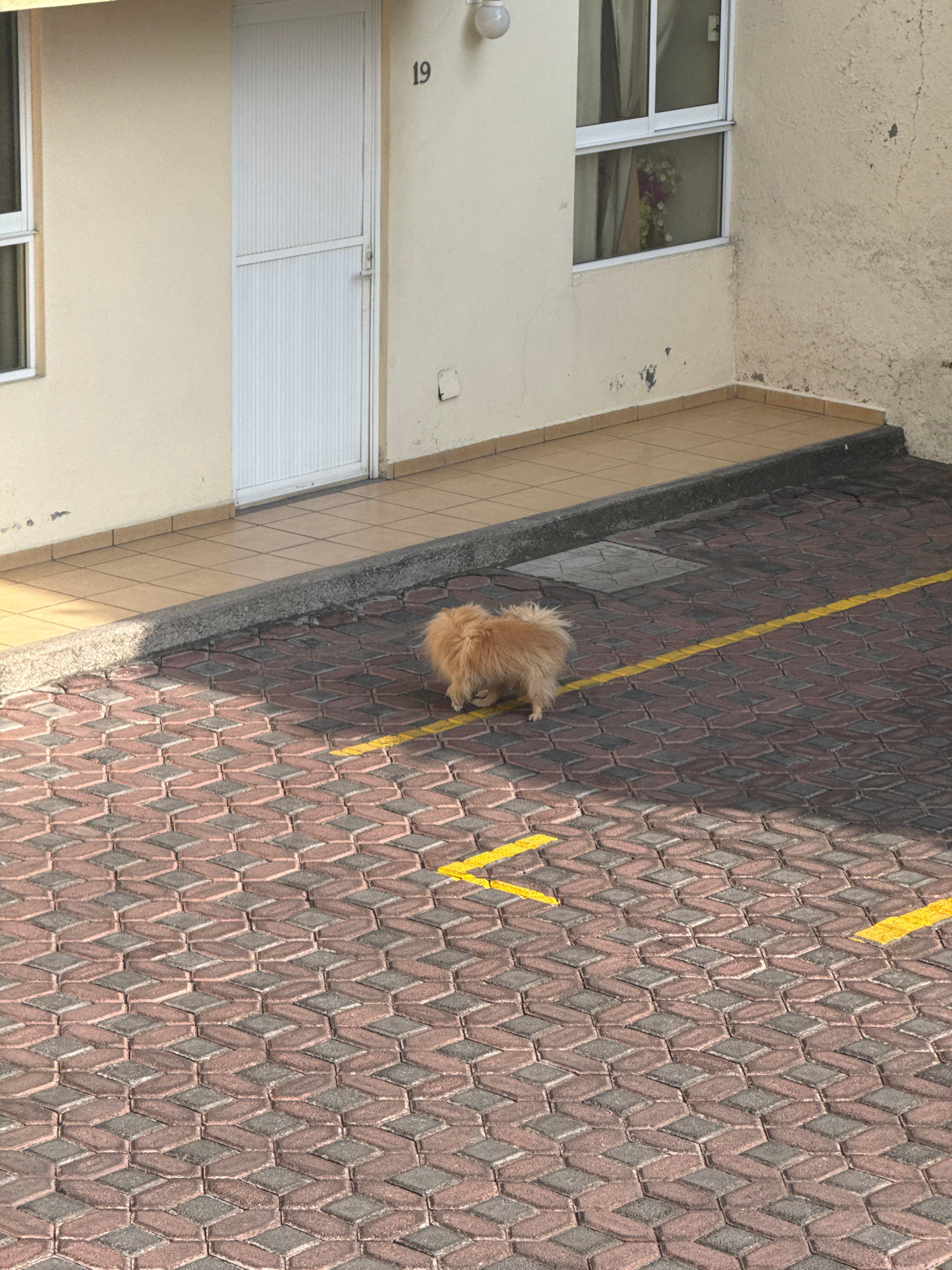 A small, fluffy, tan-colored dog sits on a brick-paved surface with yellow painted lines, possibly a parking area. The scene appears to be adjacent to a building with a white door labeled "19" and a w…read more
