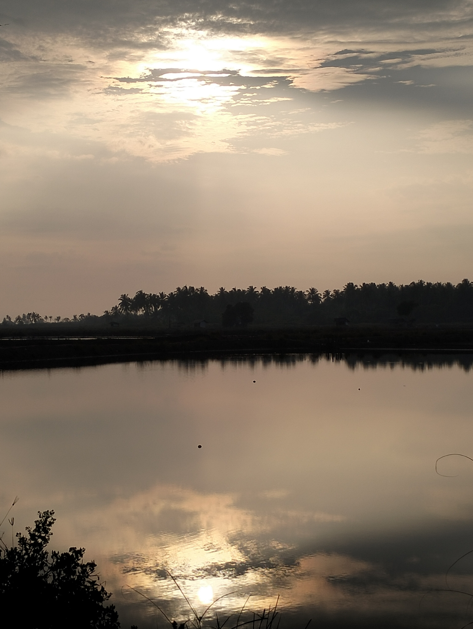 The image depicts a tranquil landscape at what appears to be sunrise or sunset in Nasebarat, Indonesia. A body of water occupies the foreground, reflecting the sky and surrounding vegetation, which su…read more