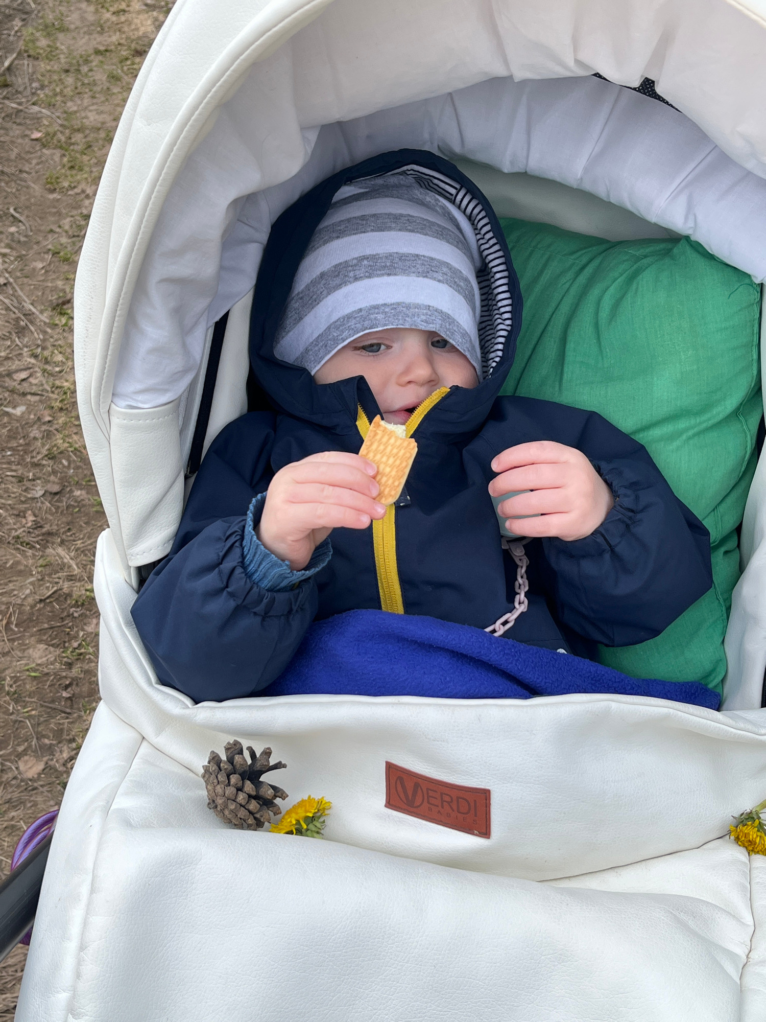 A baby lies in a white baby carriage, wearing a blue hooded jacket and a striped cap, eating a cracker. The carriage contains a green pillow and a blue blanket. A pine cone and a dandelion flower are…read more