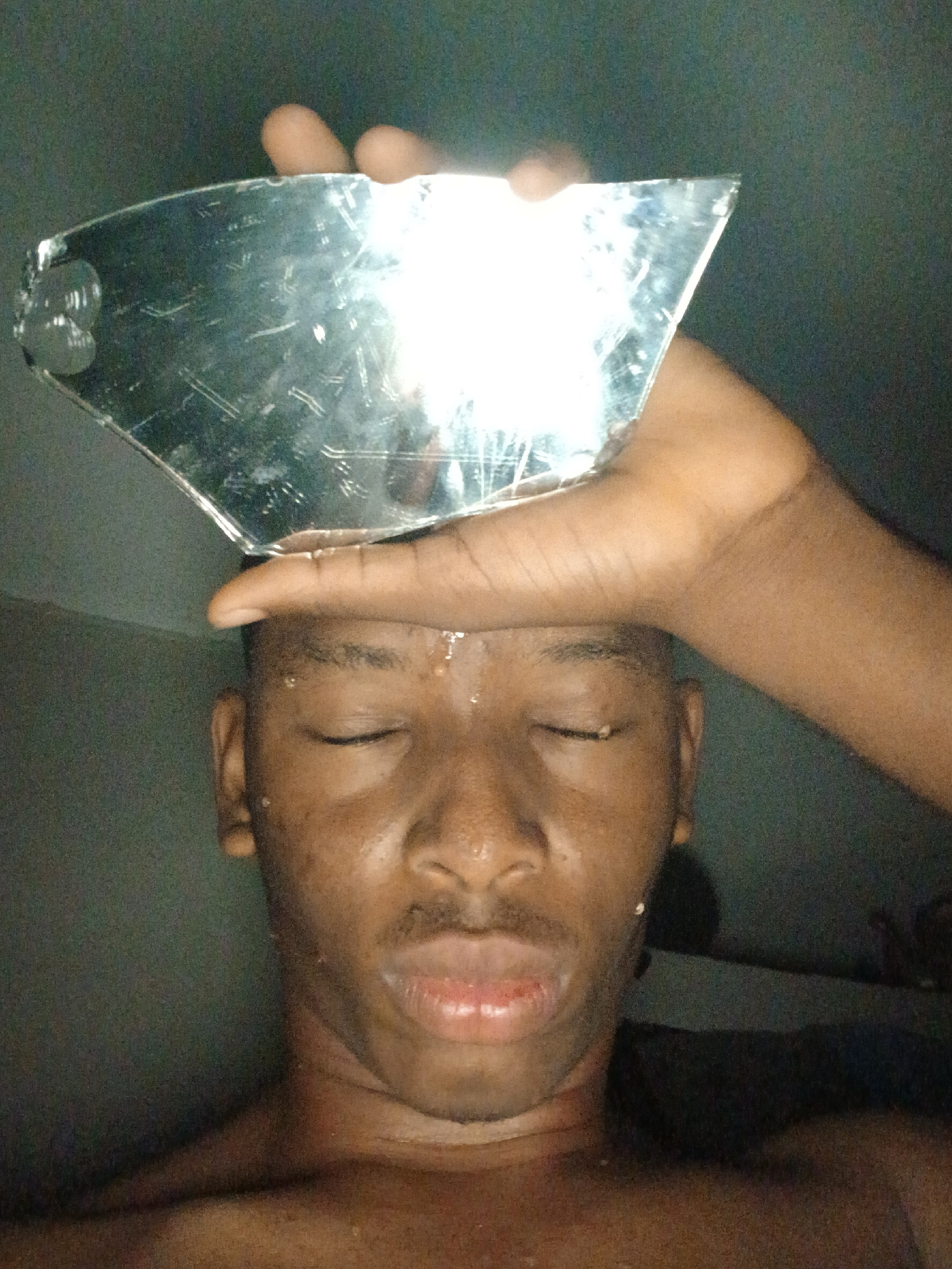 The image shows a person with dark skin, likely male, positioned on their side with their eyes closed. Drops of liquid, appearing to be water or sweat, are visible on their forehead and around their m…read more