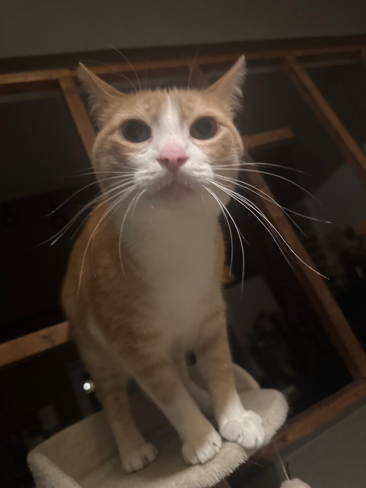 A low-angle shot depicts an orange and white cat with wide eyes and a pink nose. The cat's face is the primary focus, with long, white whiskers prominently displayed. Its paws with white pads are visi…read more