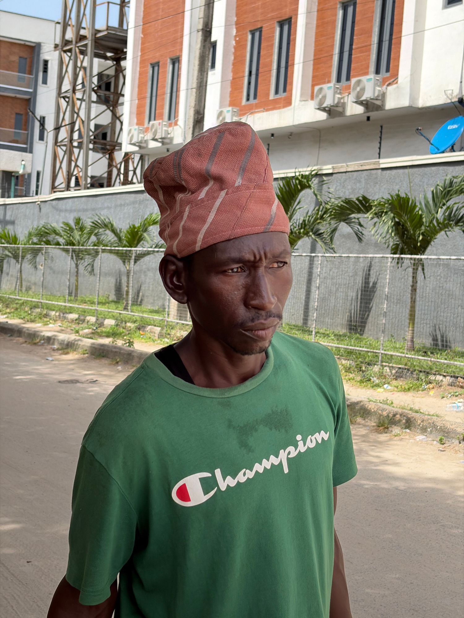 An eye-level medium shot shows a man wearing a red striped cap and a green Champion t-shirt standing on a street in Igboefon, Nigeria. The man's face is focused and slightly tilted to the left. A thre…read more