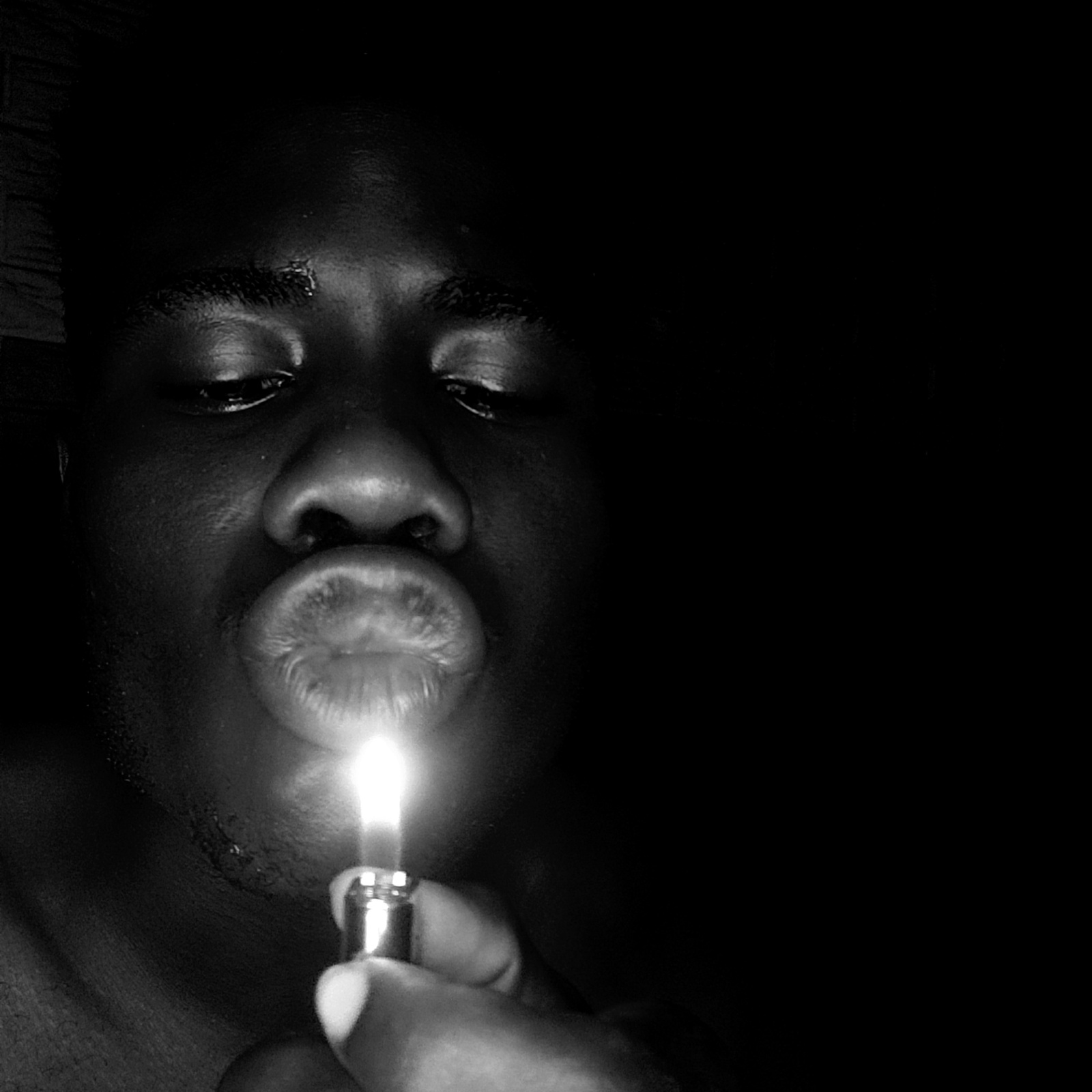 A close-up black and white image shows a person's face from the nose down. The person is dark-skinned. A hand holds a small, cylindrical object with a bright light emanating from the end, pointed towa…read more