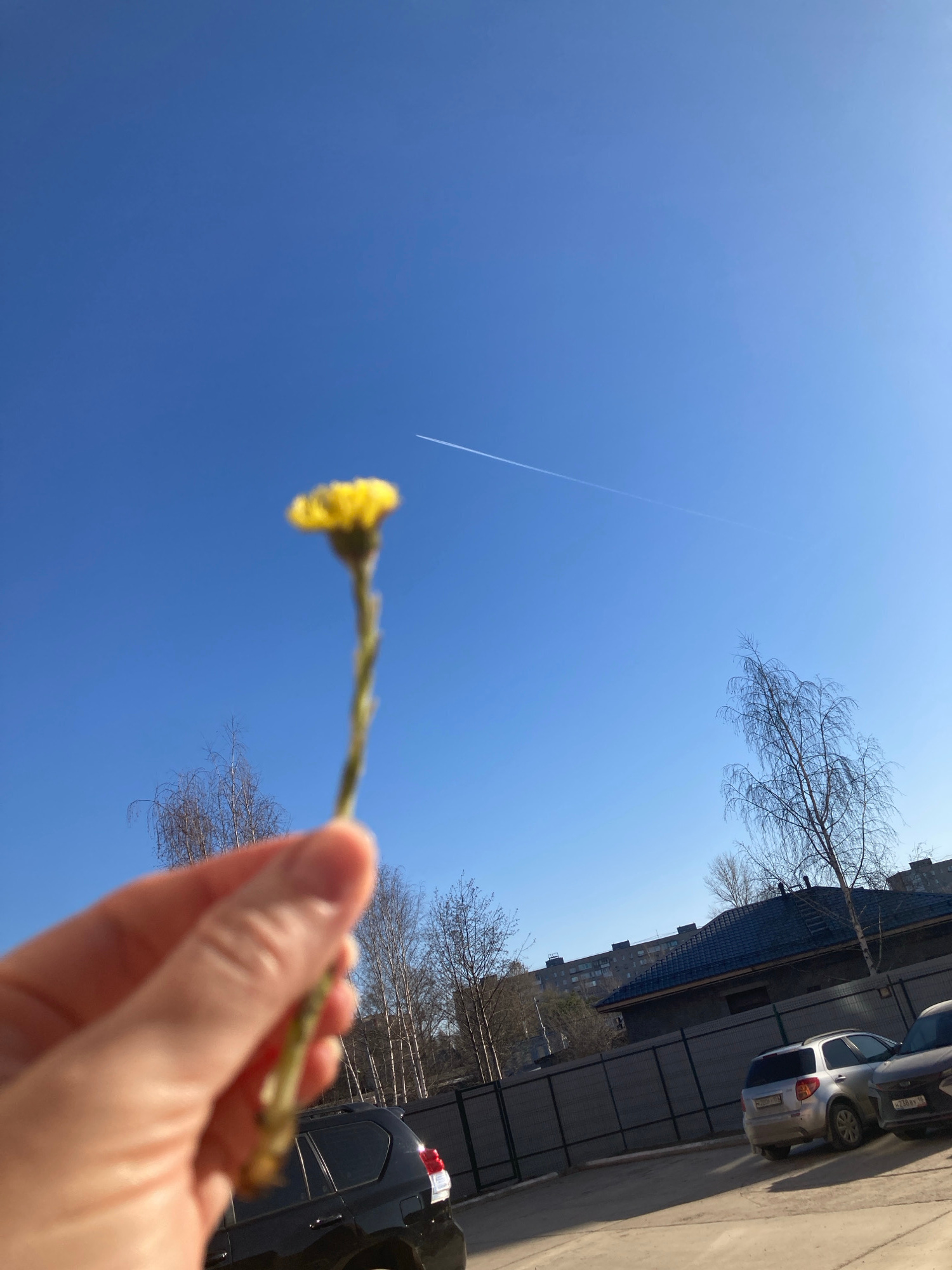 A low-angle outdoor shot captures a human hand holding a single yellow flower, likely a coltsfoot, against a bright, clear blue sky. The hand and flower are in the foreground, with the flower's yellow…read more