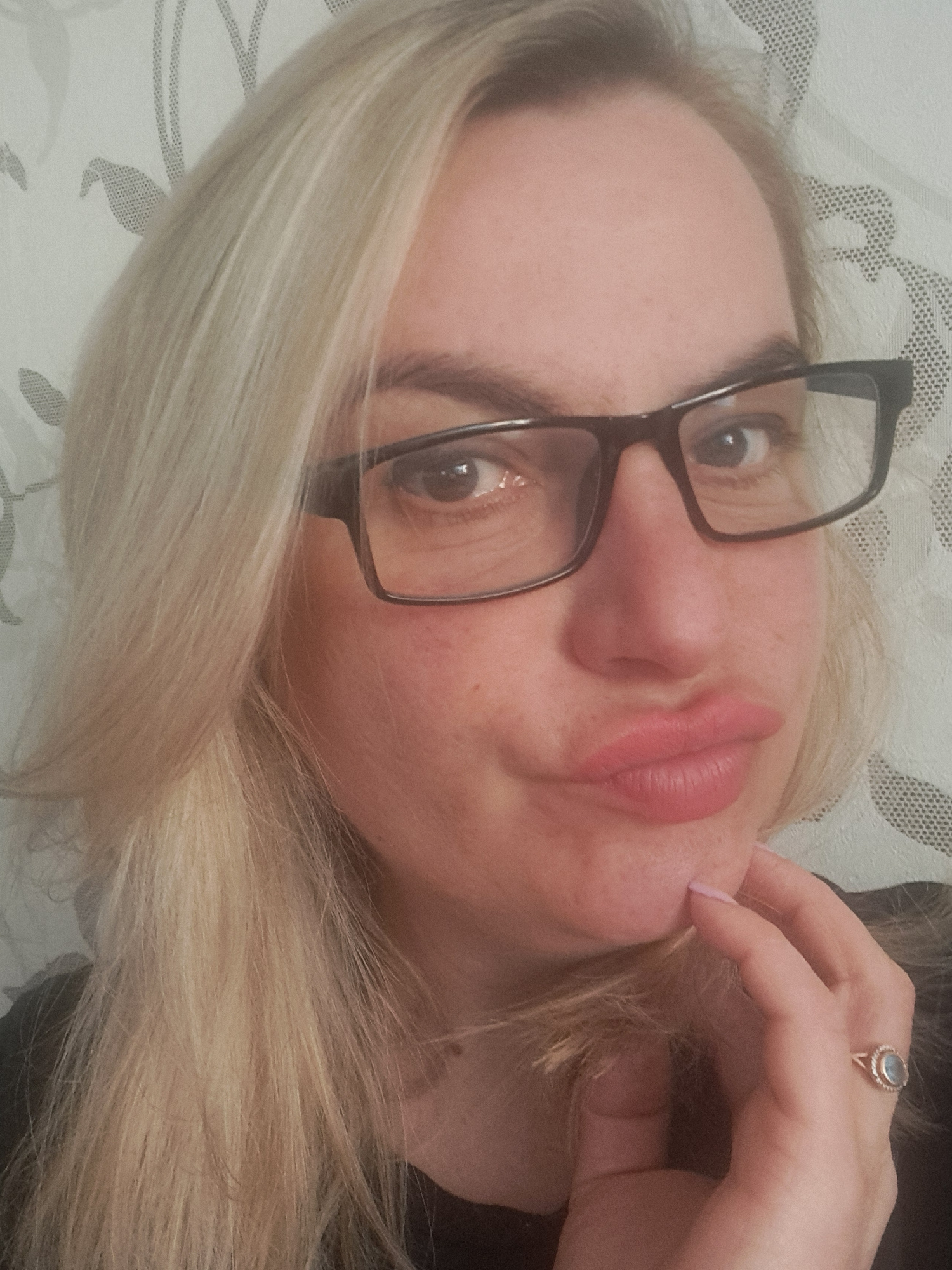 A woman with blonde hair and glasses is lying down, looking directly at the camera. Her head is tilted to the left. She is wearing a ring on her right hand, which is near her face. The background appe…read more