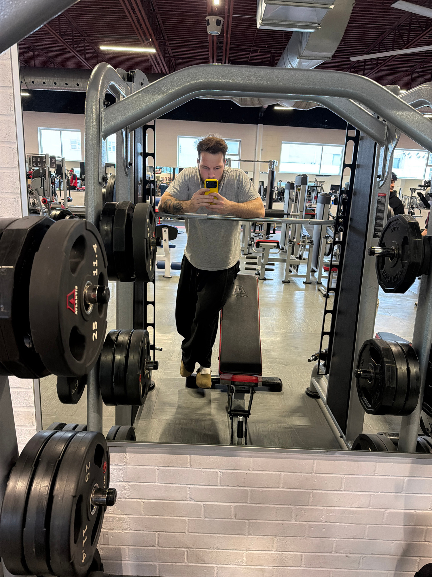 The image depicts a man in a gym setting, specifically at Éconofitness Laval Chomedey in Laval, Canada. The reflection shows the man holding a yellow phone, taking a selfie. He is wearing a gray t-shi…read more