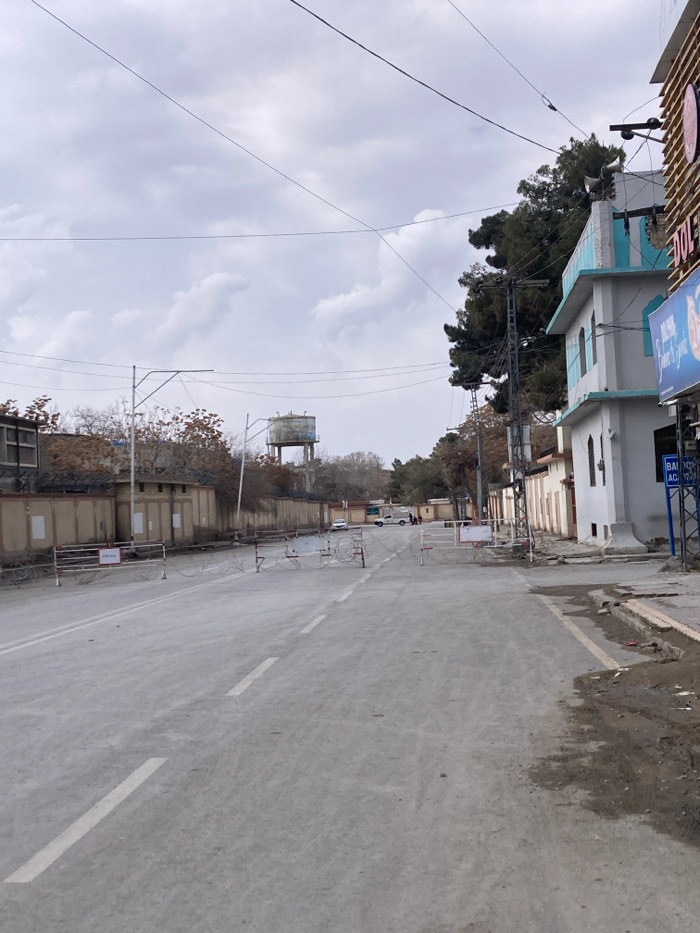 The image captures a street scene in Quetta City Tehsil, Pakistan, under an overcast sky. The asphalt road, marked with white dashed and solid lines, extends into the distance. In the midground, multi…read more
